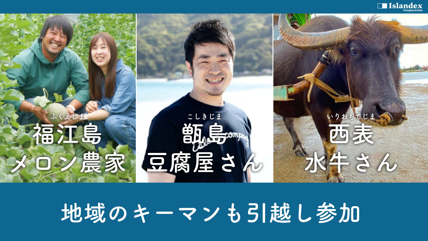 福江島のメロン農家さん、甑島の豆腐屋さん、西表の水牛さん。