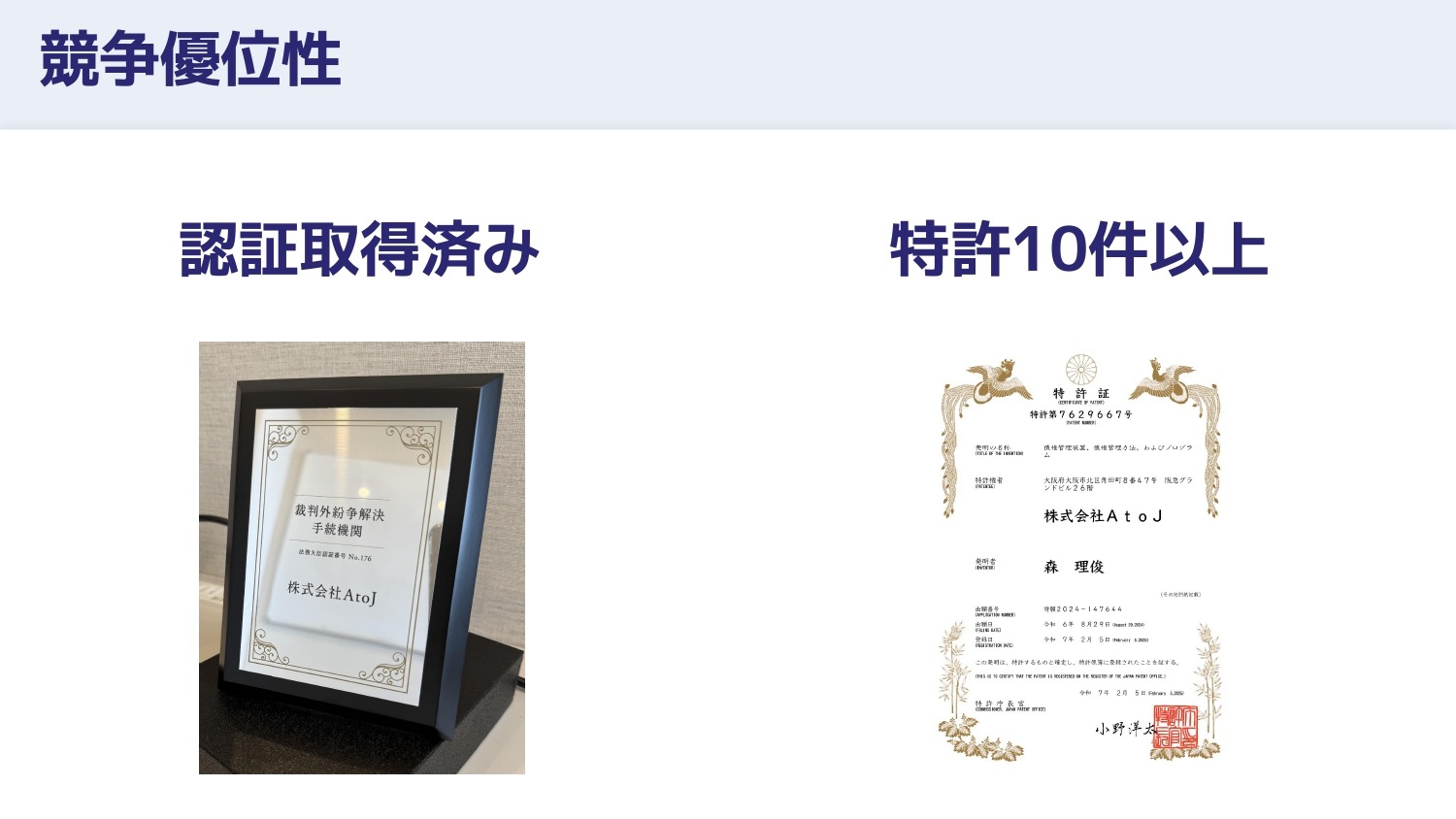 法務大臣の認証を取得し、特許も10件以上申請済みで、取得も続々と進んでいます。