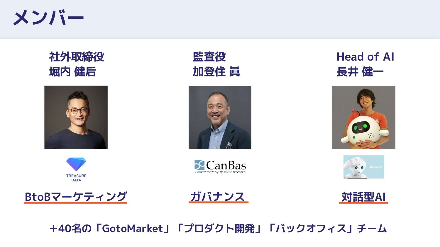 さらにB2Bマーケティングの拡大に向けて、堀内(健后さん)が社外取締役に、ガバナンスの強化に向けて加登住(眞さん)が監査役に、対話型AIの搭載に向けて長井(健一さん)が入り、40名のチームで、日本で生まれた対話型ODRを引っ張っています。