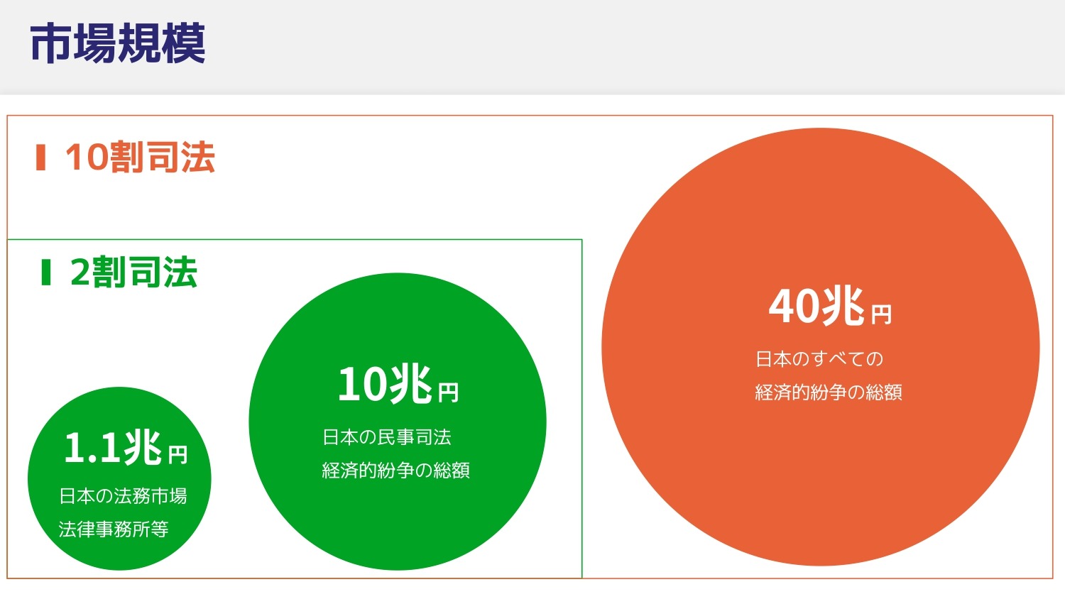 2割司法の中の法務市場は1.1兆円、日本の裁判所が取り扱うのは10兆円です。