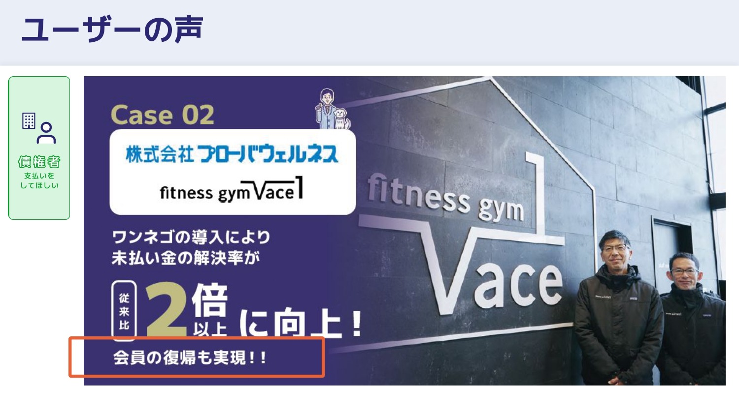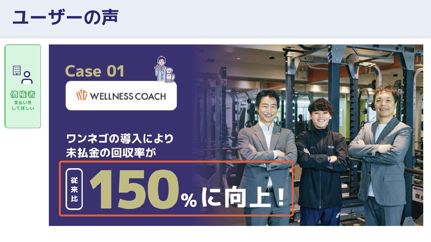 債権者ユーザーの声として、ワンネゴの導入により従来比150%の解決を実現したり、一度退会した会員が戻ってくるという現象が複数のフィットネス企業で起きたりしています。