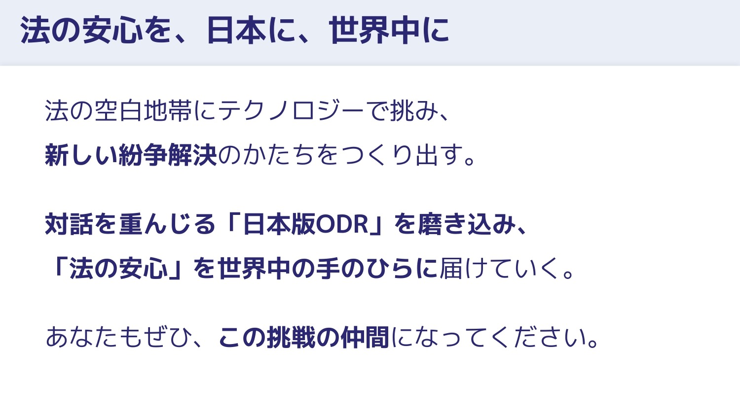ODRを日本に根付かせ、対話を重んじる「日本版ODR」として磨き込み、「法の安心」を世界中に届けていきます。