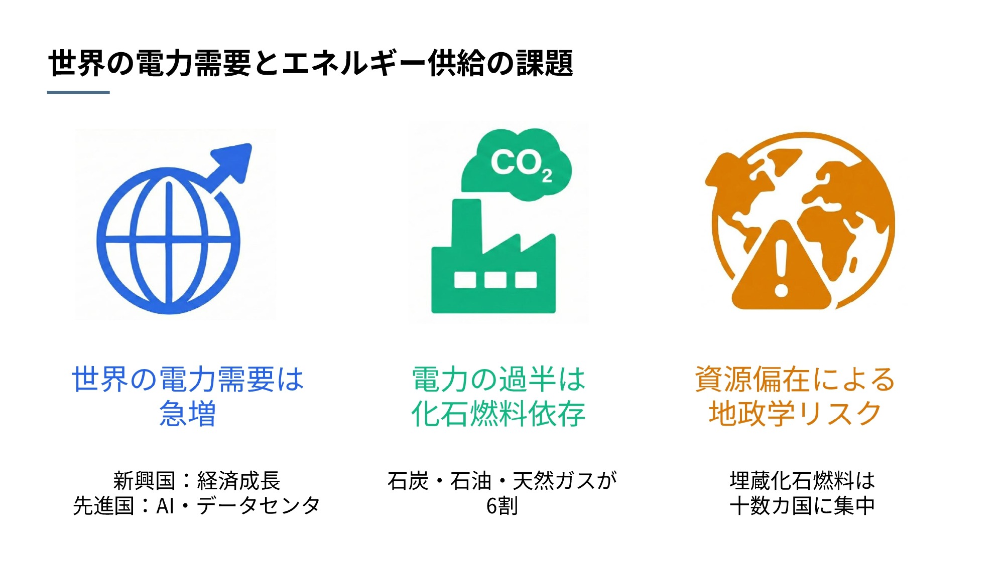 まず、私たちが直面している世界のエネルギー課題についてお話しします。