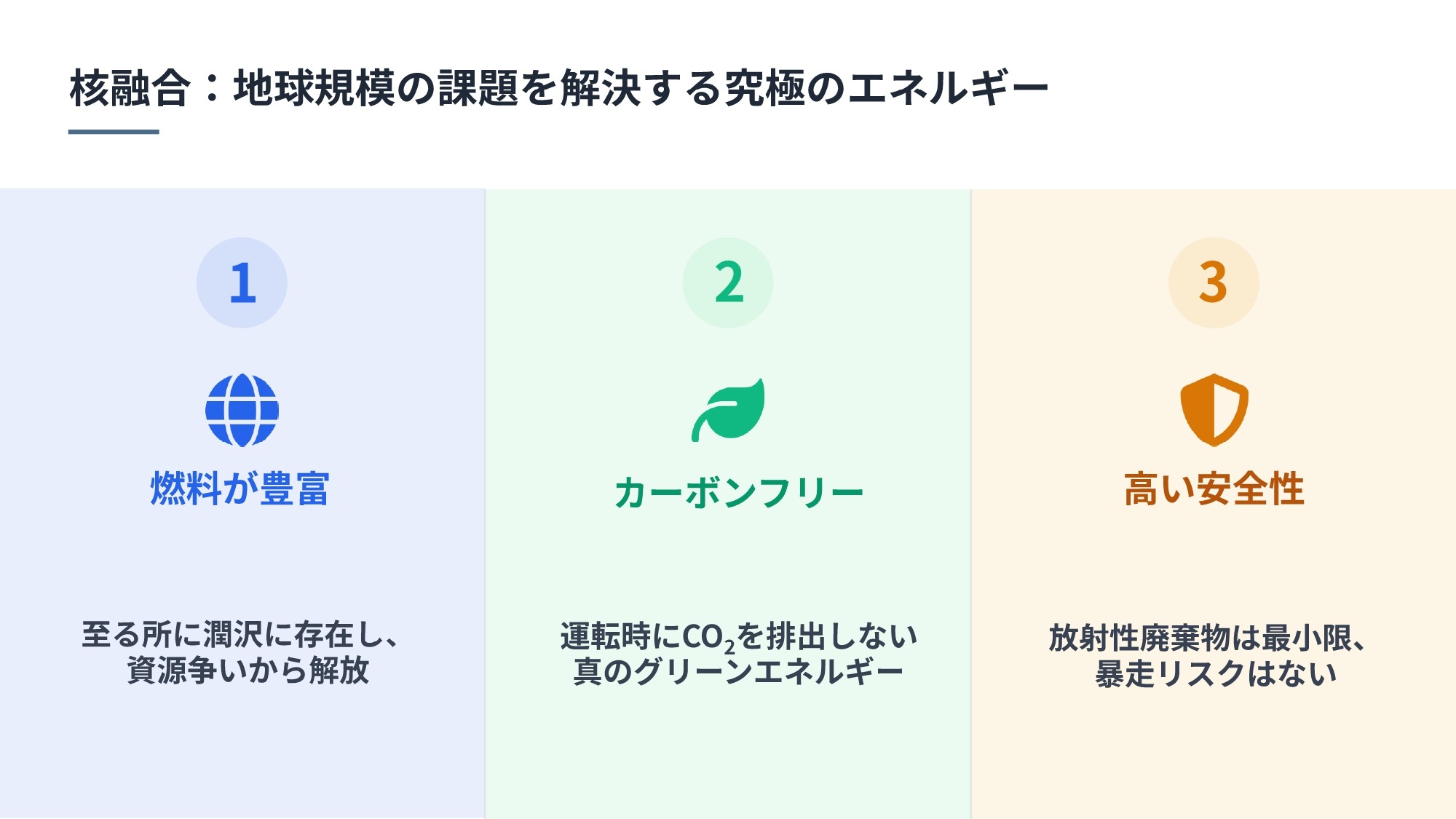 第一に、燃料が海水などに豊富に存在し、資源争いから解放されること。
