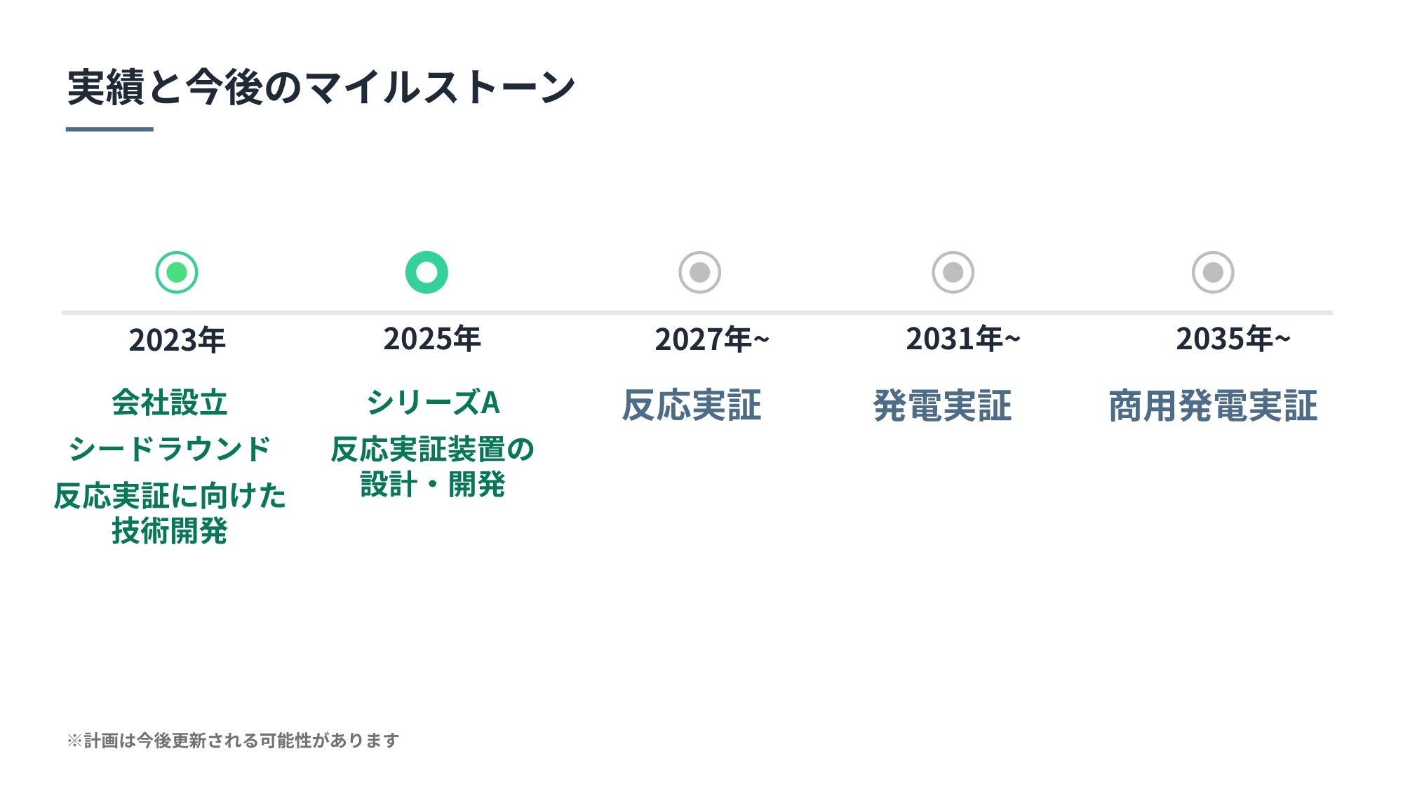 今後数年で反応実証を完了、2031年に初の発電実証を経て、2035年には商用発電の実証へと突き進みます。