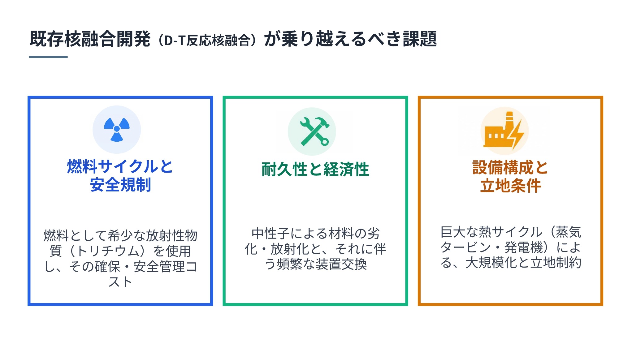 現在、核融合の主流である「D-T反応(水素の同位体である重水素(D)と三重水素(T)による核融合反応)」には、避けて通れない3つの大きな課題があります。