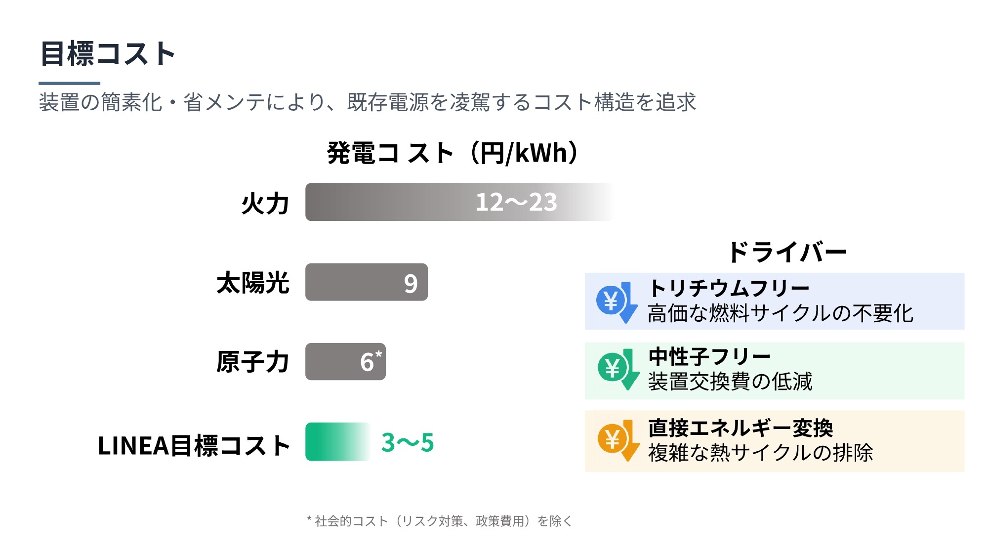 複雑な熱サイクルを排除し、中性子フリーを実現することで、既存のあらゆる電源を圧倒するコスト構造を追求していきます。