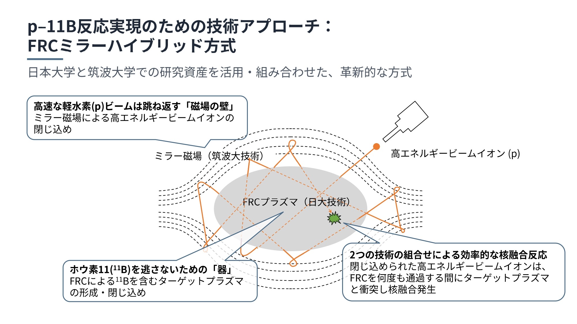 まず日本大学が誇るFRC(Field-Reversed Configuration、磁場反転配位)と呼ばれるプラズマ閉じ込め方式が、ホウ素プラズマを逃さないための「燃料の器」を実現します。