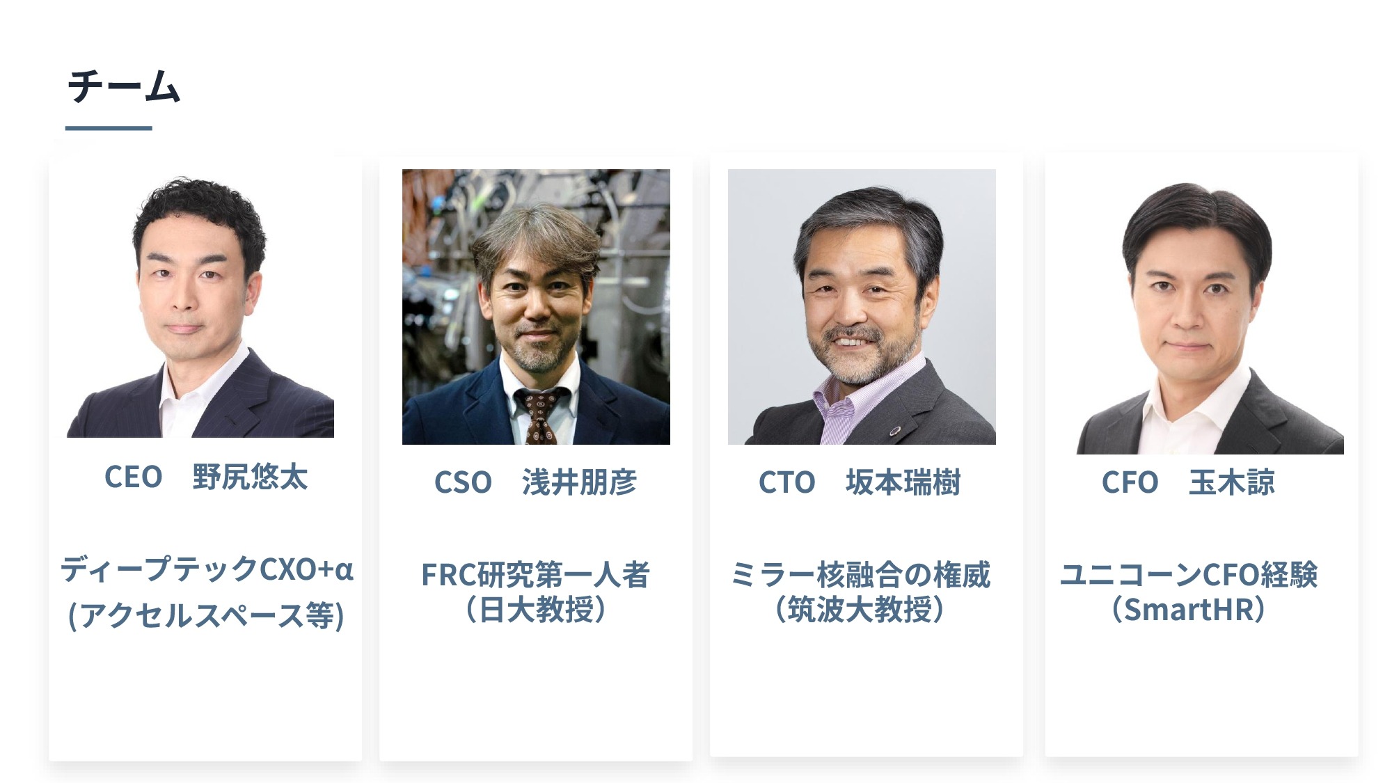 宇宙スタートアップで開発と経営の両輪を担った私に加え、FRC研究の第一人者である浅井(朋彦)教授、ミラー核融合の権威である坂本(瑞樹)教授、そしてユニコーン企業のSmartHRでCFOを務めた玉木(諒さん)が参画し、ビジネスとしての確実性を担保しています。