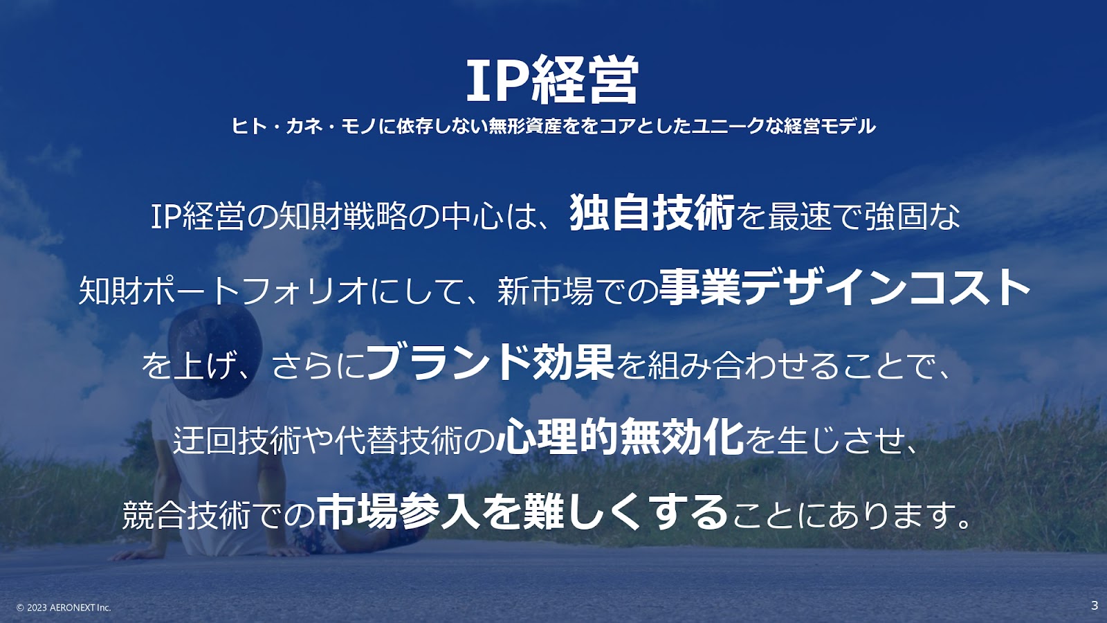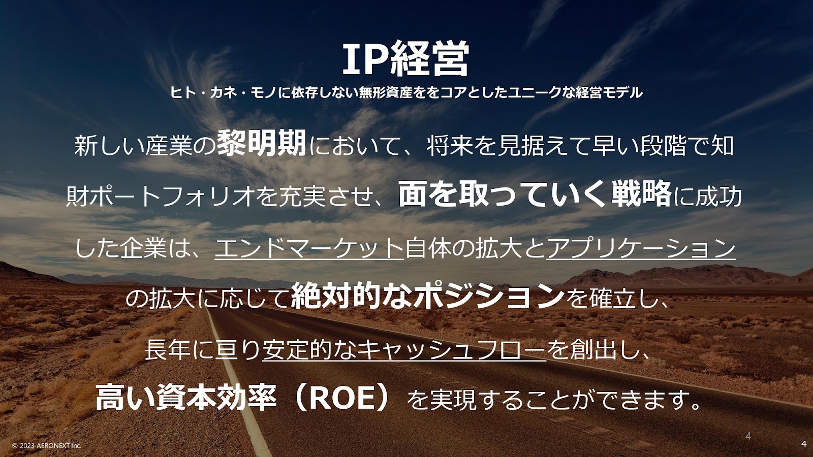 このIP経営の中心が知的財産戦略ですが、特許を守りではなく、攻めで使うやり方をしています。