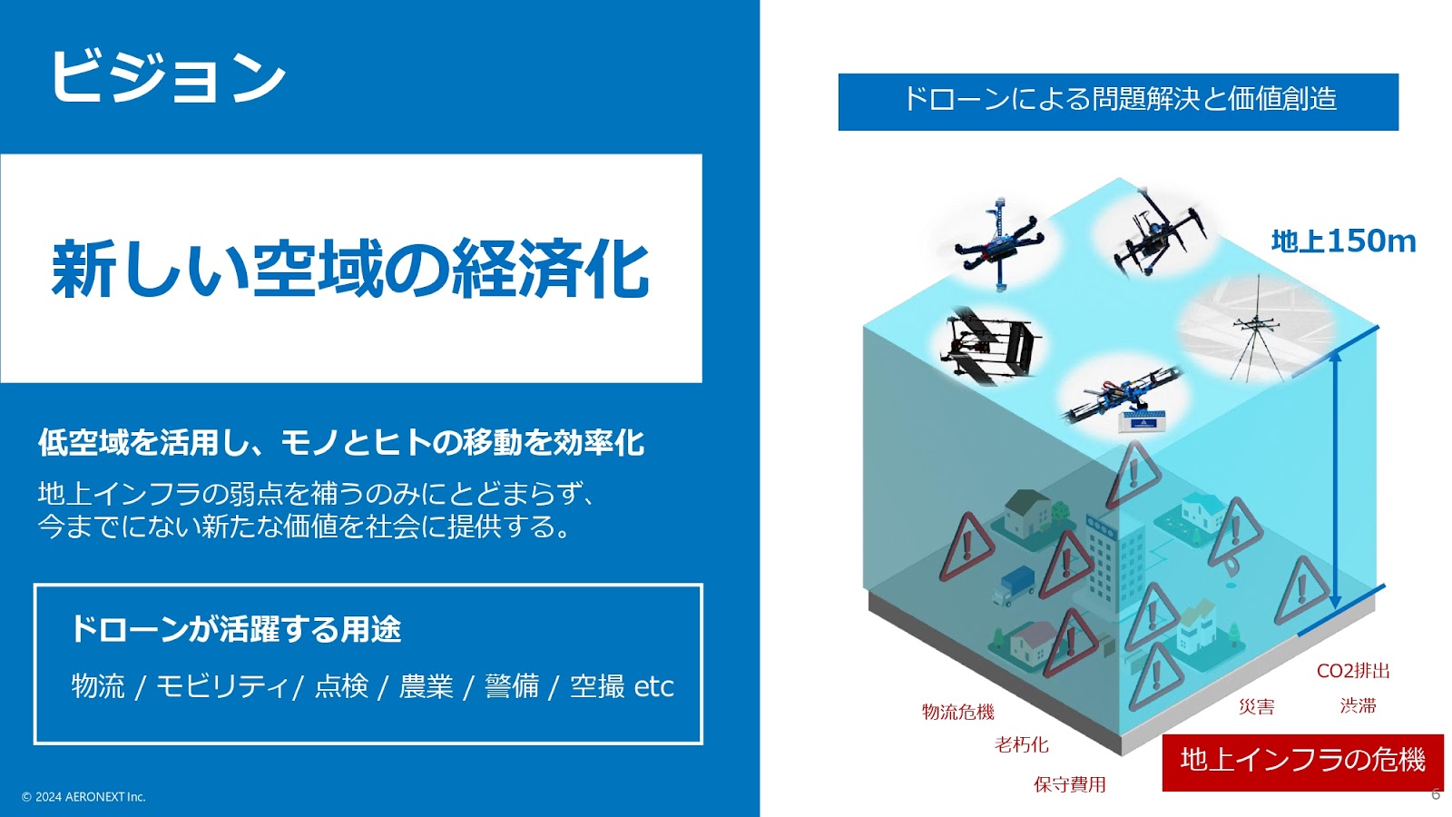 成し遂げたい未来は、地上から150mの低空域を経済活動の場に変えることで、2017年に創業しました。