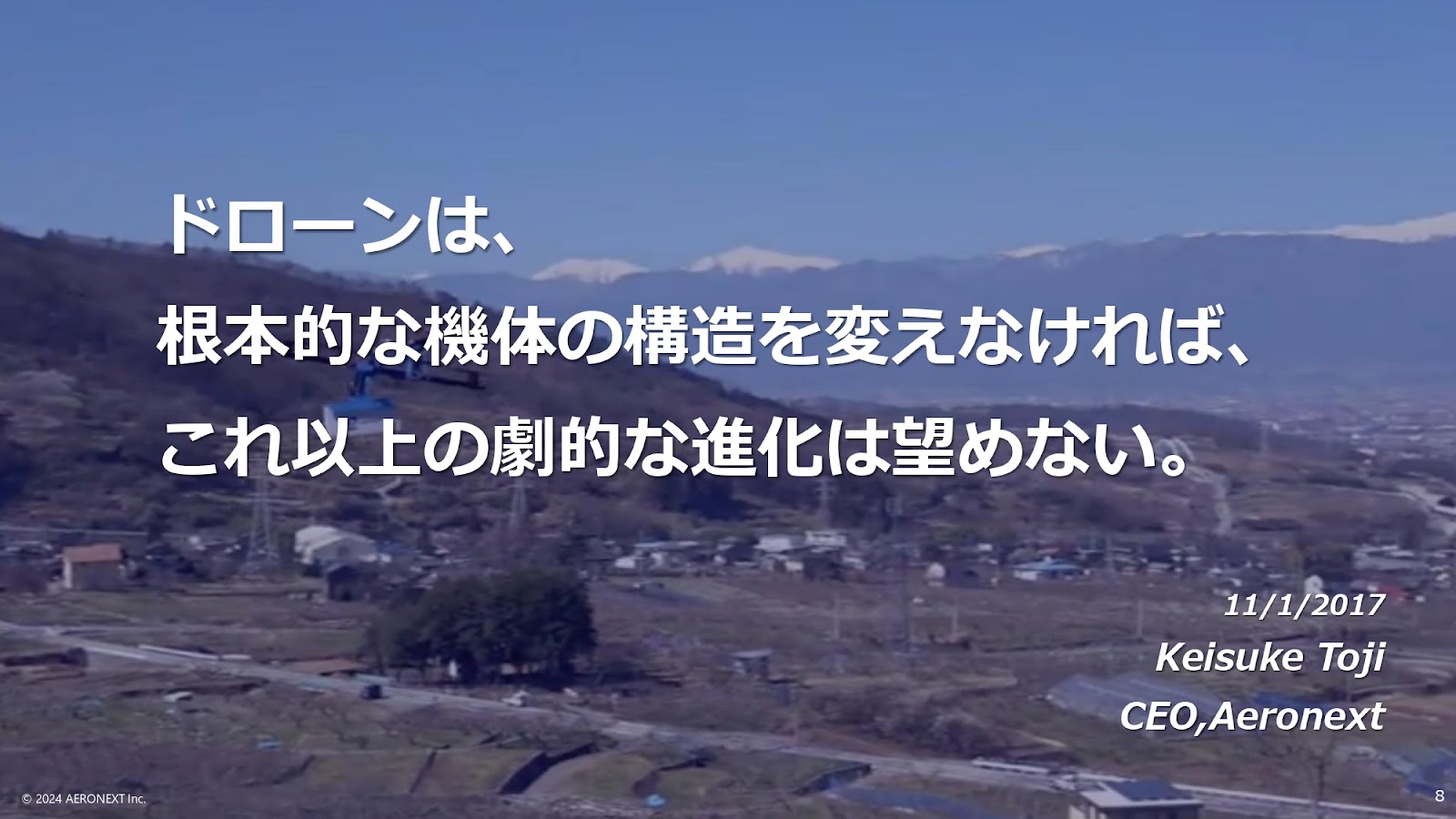 ヒトを運んだりモノを運んだりするドローンという話になりますが、おそらくホバリング型のドローンでは、そういった未来が来ないと創業期から思っていました。