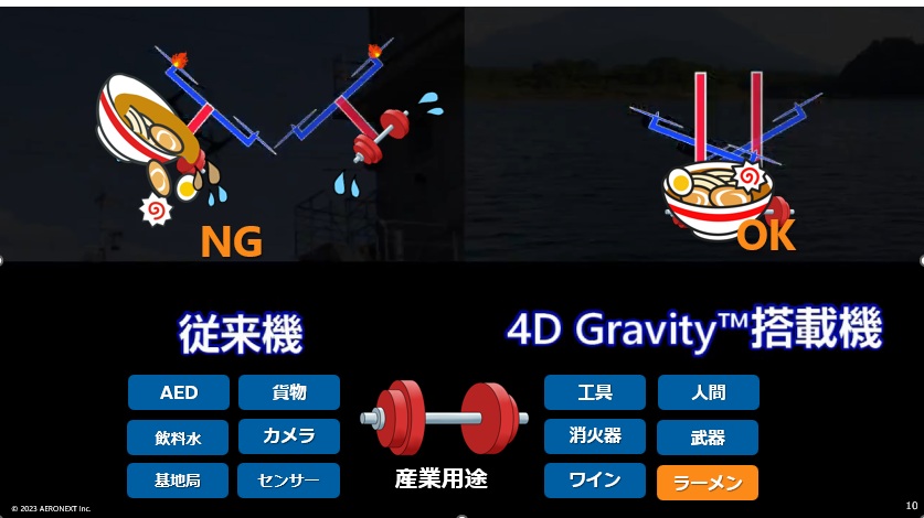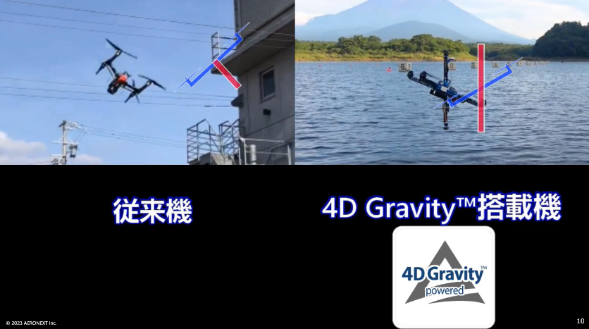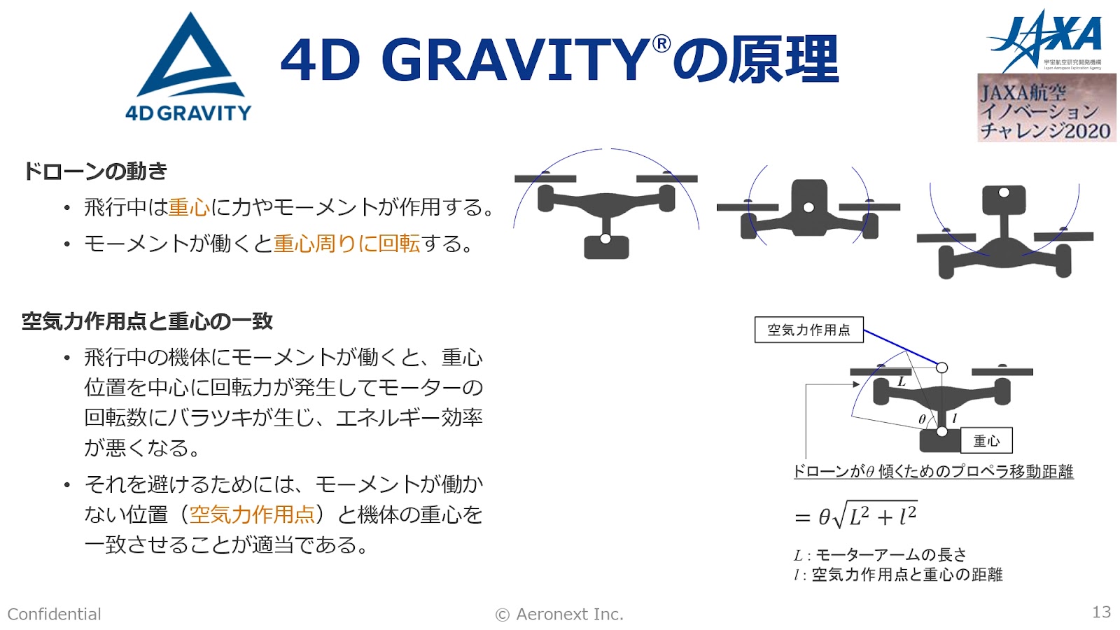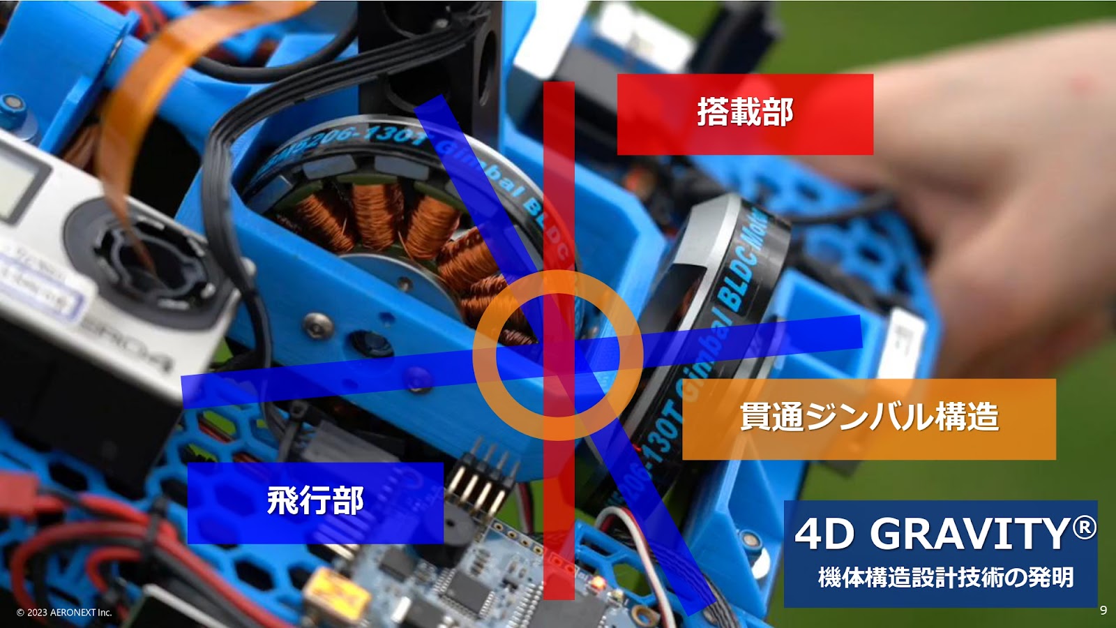 飛行体は重心の位置が常に状態によって変わるので、重心を可変にすることで、機体の安定を作る技術を、「4D GRAVITY」と呼んでいます。