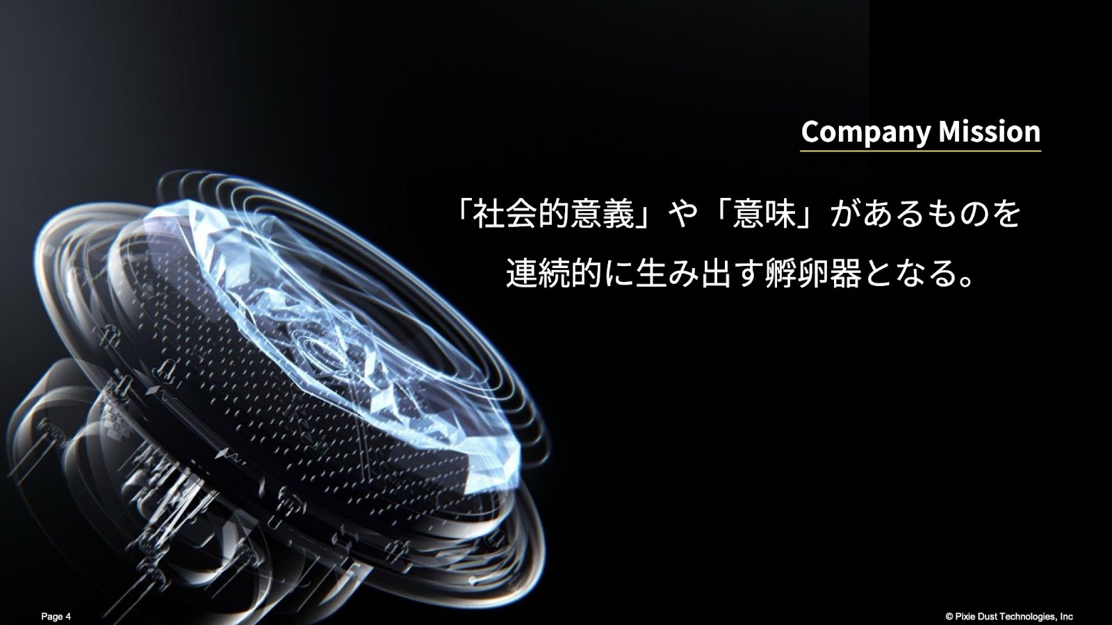 ピクシーダストテクノロジーズは、「社会的意義」や「意味」があるものを連続的に生み出す孵卵器となる、をミッションに掲げています。