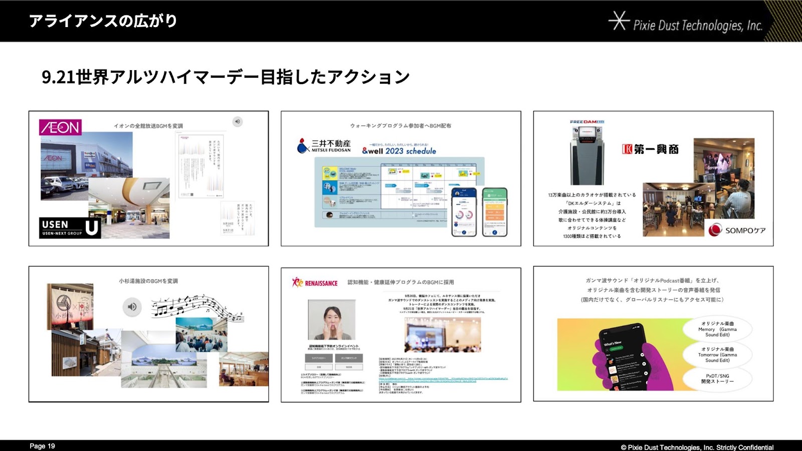 ▶ピクシーダストテクノロジーズ、塩野義製薬、シオノギヘルスケアによる音で認知症に挑む「ガンマ波サウンド」の取り組み拡張について ~商業施設や音声メディアなど、多くの場所で音を介した認知機能ケアを体験できる社会へ~ 2023.09.21(ピクシーダストテクノロジーズ)