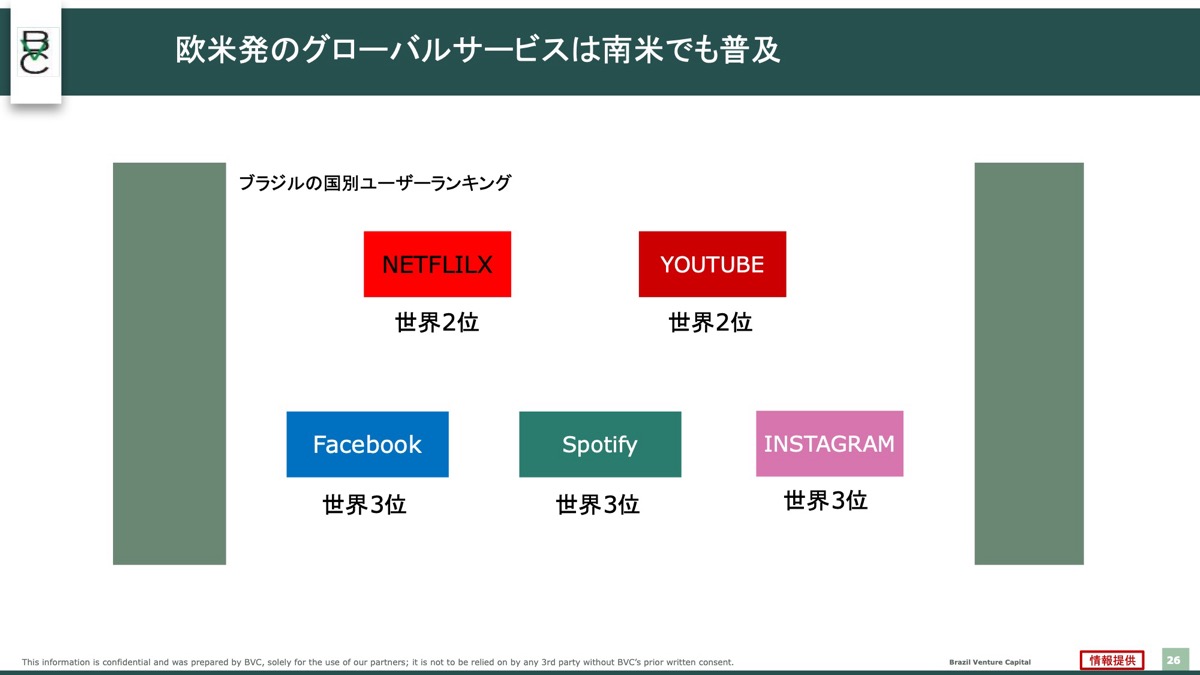 ブラジルは、人口が2.1億人で大きいので、国境や規制に関係ない、フリーのグローバルテックサービスがあったとすると、開発本国の次にブラジルが来ると言われています。