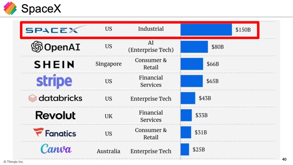 最初にお伝えしたいのは、アメリカの未上場の会社のうち、一番大きいのはSpaceXです。