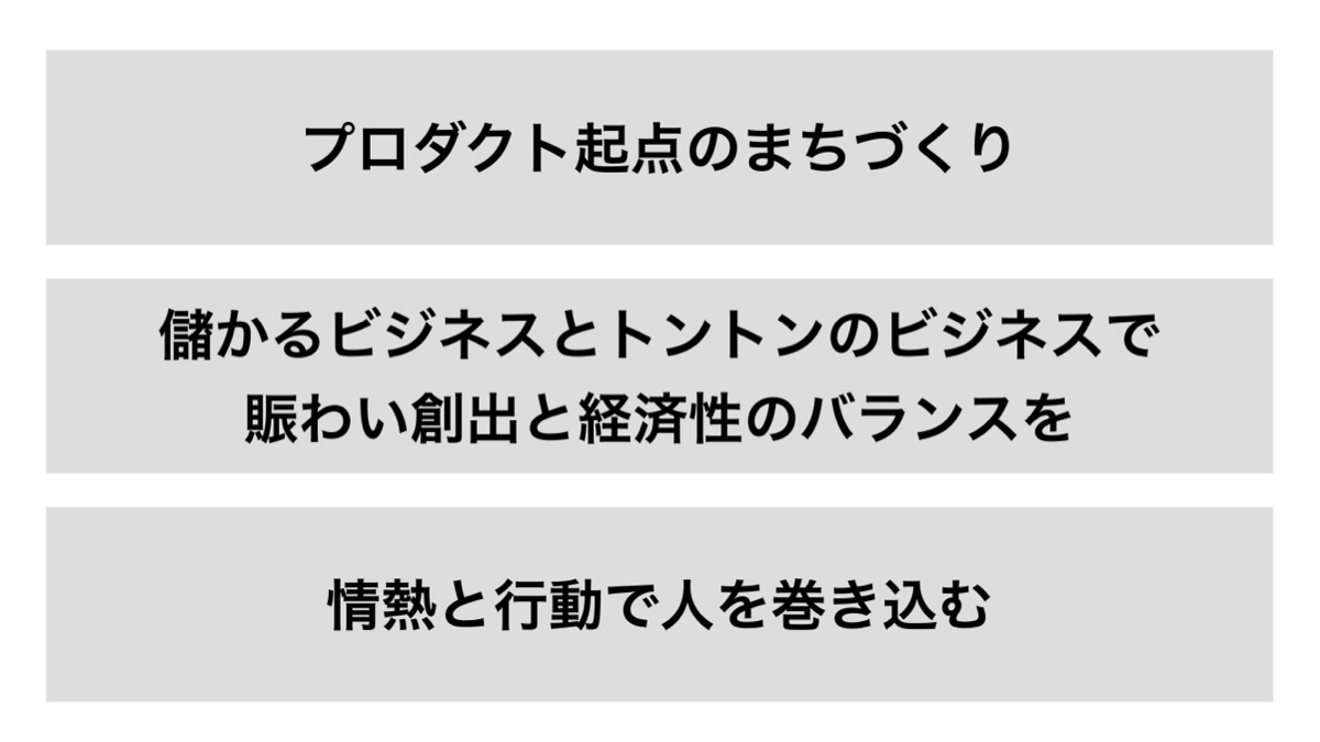 最後に、エッセンスとして、よく言わせてもらっているのが、「まちづくりはプロダクト起点であるべき」ということです。