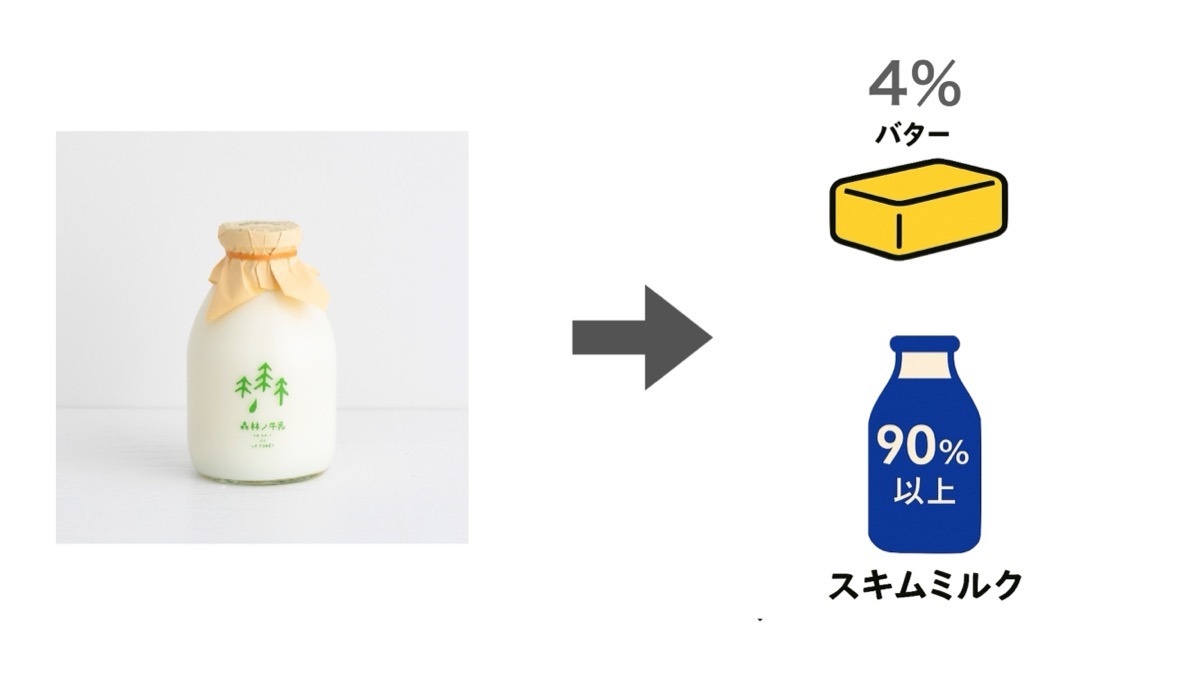 牛乳をバターにする時、牛乳の乳脂肪分がバターになるので、牛乳を100とすると、バターになるのはたった4%です。
