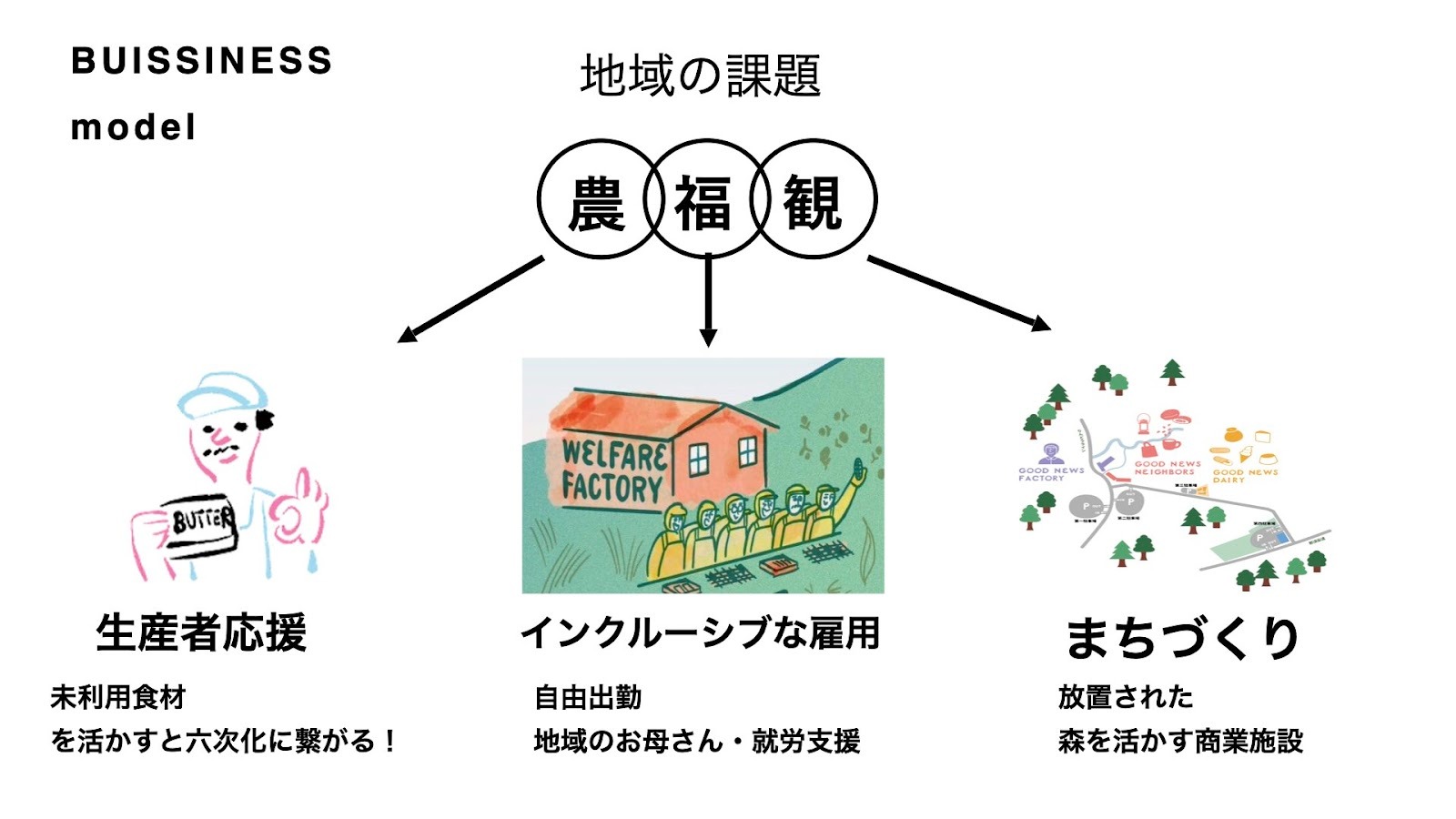 それぞれの課題について、未利用食を使う、インクルーシブに雇用する、製品によって町を作る、などしています。