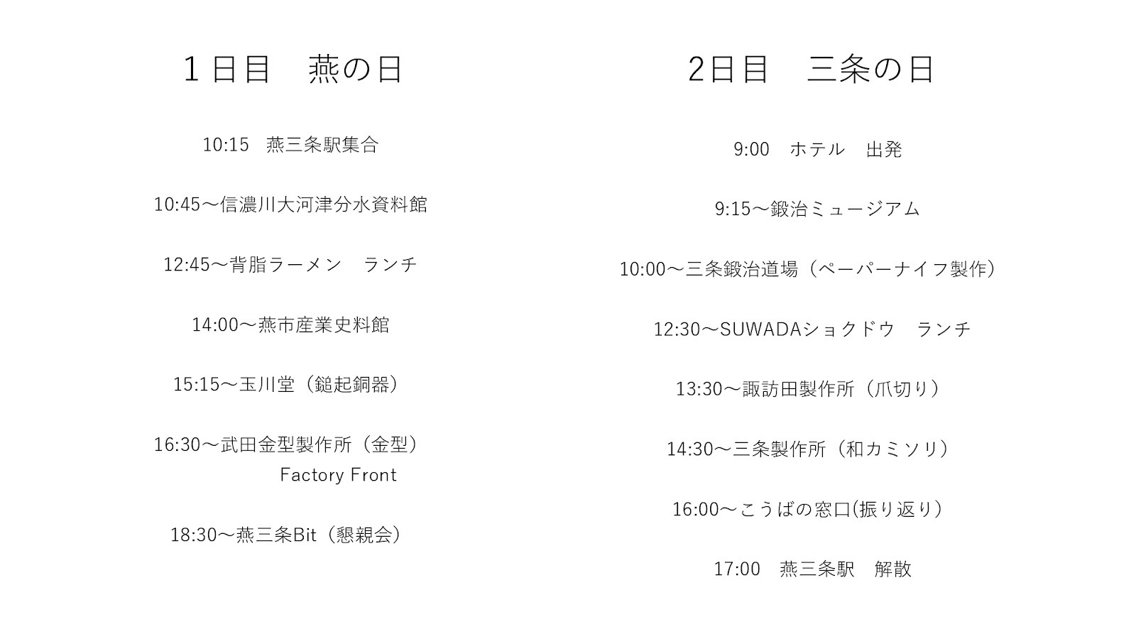 今回、個性豊かな町燕三条、個性が強いがゆえ、なぜそうなったかの数々、その理由まで迫る2日間の旅にご案内したいと思います。