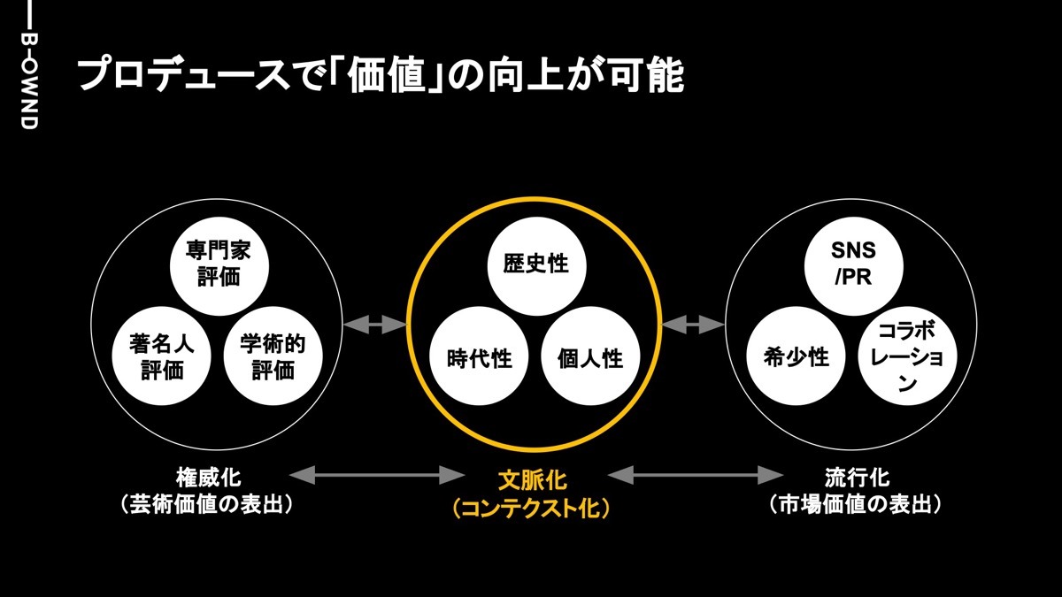 まとめると、「文脈化」「権威化」「流行化」によって付加価値みたいなものが生み出されると考えています。