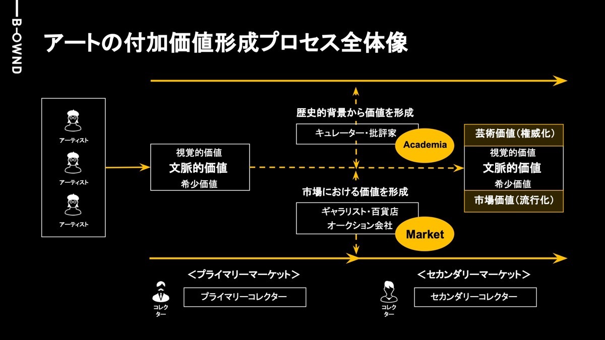 一方、下には「コレクター」とありますが、市場には、ギャラリーなどの「プライマリーマーケット」とオークションなどの「セカンダリーマーケット」の2つがあり、市場が作品の価格を決めるので、市場価値が後から付加されるのです。
