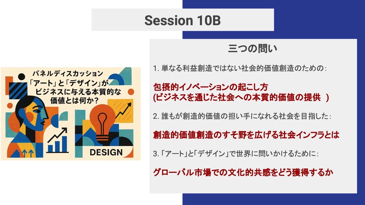 今日の問いは、包摂的イノベーションの起こし方、創造的価値創造のすそ野を広げる社会インフラとは、そしてグローバル市場での文化的共感をどう獲得するか、です。