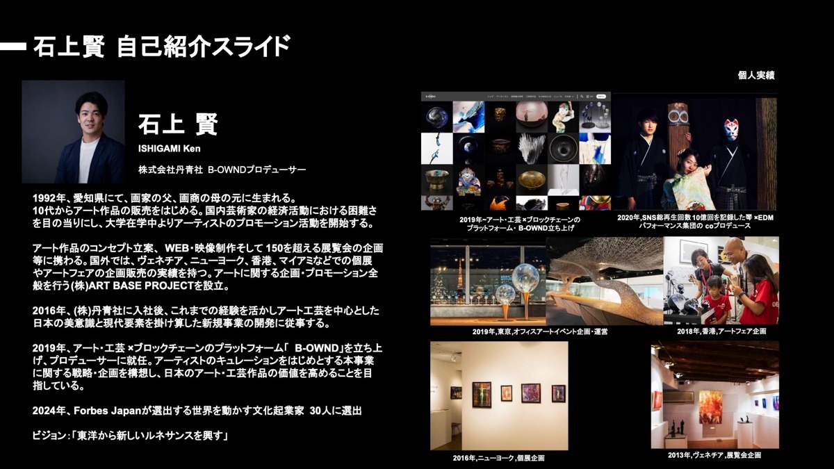 1992年、愛知県にて、画家の父、画商の母の元に生まれる。10代からアート作品の販売をはじめる。国内芸術家の経済活動における困難さを目の当りにし、大学在学中よりアーティストのプロモーション活動を開始する。アート作品のコンセプト立案、WEB・映像制作そして150を超える展覧会の企画等に携わる。国外では、ヴェネチア、ニューヨーク、香港、マイアミなどでの個展やアートフェアの企画販売の実績を持つ。2016年、(株)丹青社に入社後、これまでの経験を活かしアート工芸を中心とした日本の美意識と現代要素を掛け算した新規事業の開発に従事する。2019年、アート・工芸×ブロックチェーンのプラットフォーム「B-OWND」を立ち上げ、プロデューサーに就任。アーティストのキュレーションをはじめとする本事業に関する戦略・企画を構想し、日本のアート・工芸作品の価値を高めることを目指している。2024年、Forbes Japanが選出する世界を動かす文化起業家30人に選出。