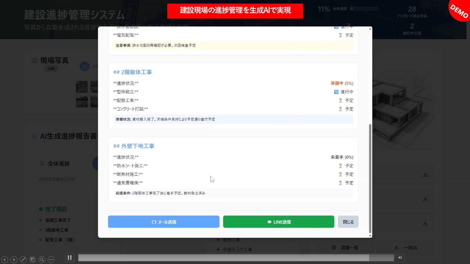 現場監督はLINEのメッセージを頻繁に受け取るので、LINEしてほしいというケースもあるので、要約して、メールやLINEで送ることも行われています。