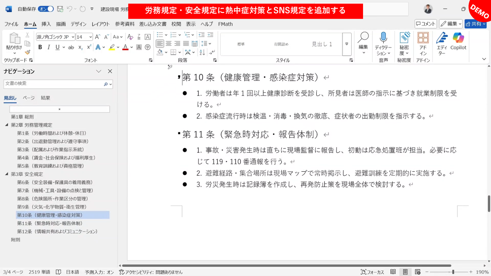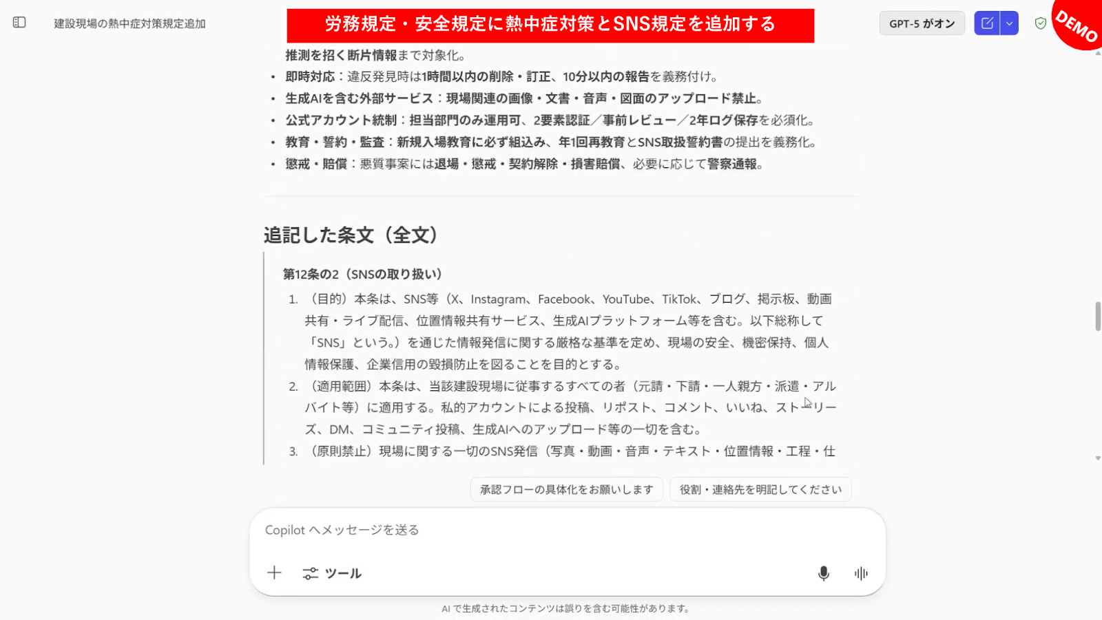 この内容に、熱中症対策の規定を追加してくださいと指示をします。