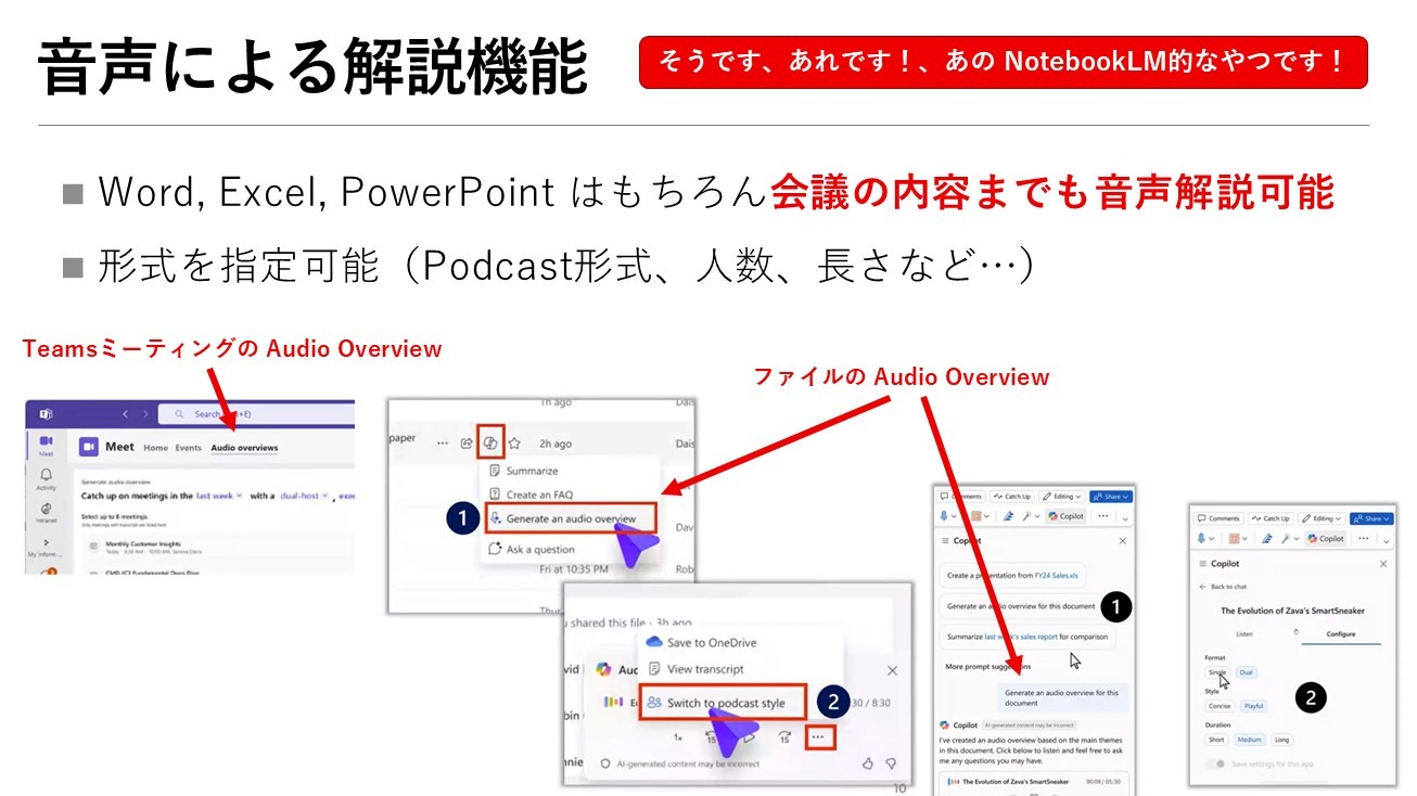 ファイルのAudio Overview、ExcelデータのAudio Overview、この機能が入るので、NotebookLMみたいなものが、オフィス製品全部に入ってくるのです。
