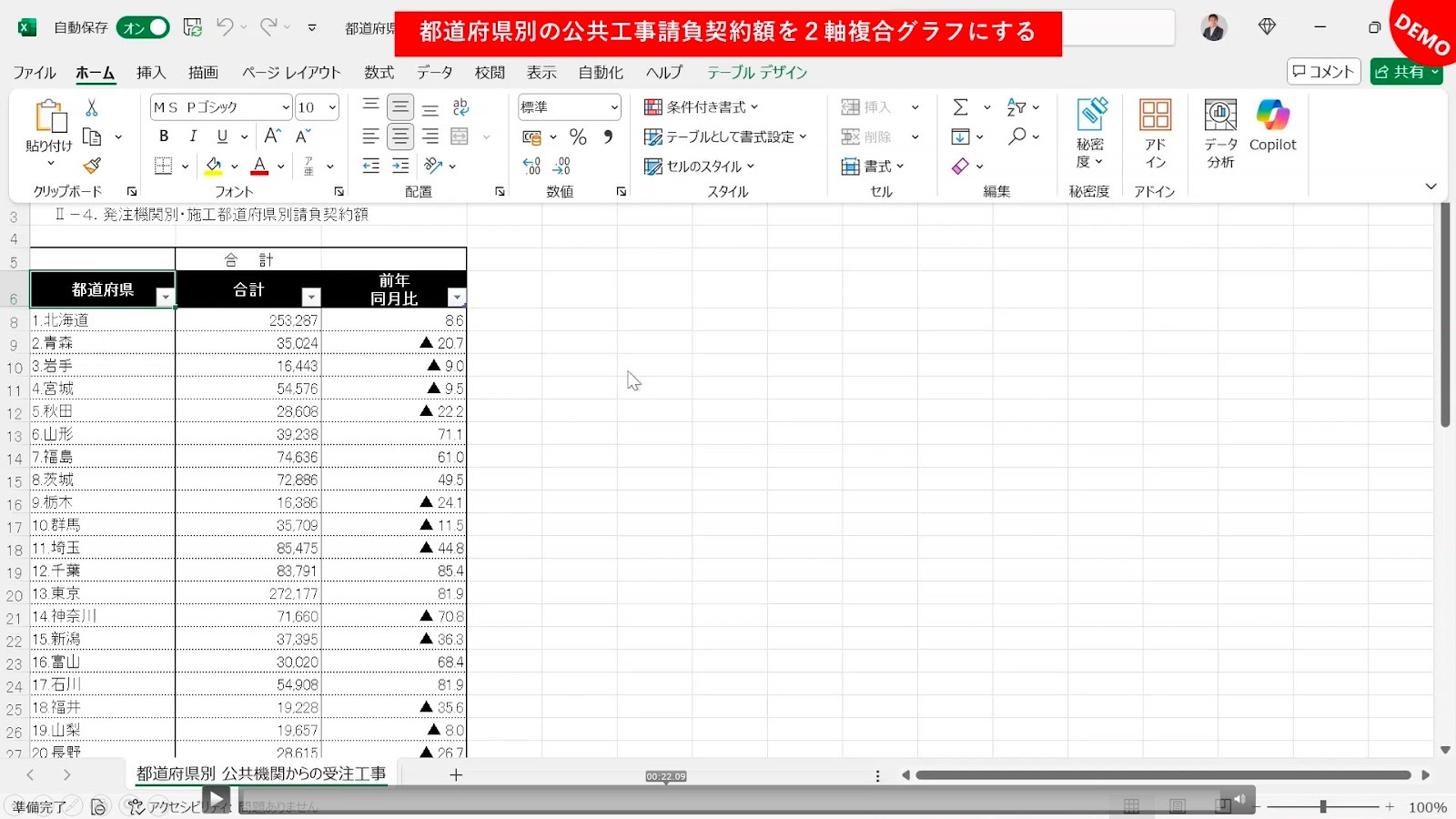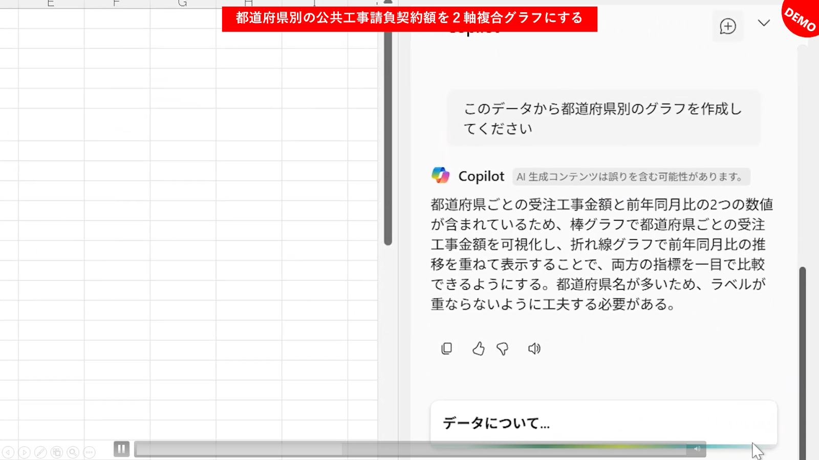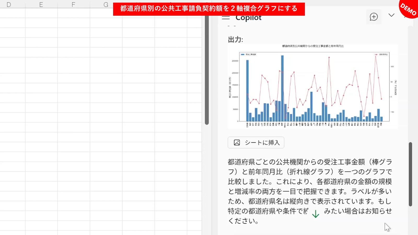 ですから、このデータから都道府県別のグラフを作成してくださいと言うだけで、AIは「合計もあって、前年同月比もあるのね、都道府県は左にあるのね、わかった」という風に、棒グラフと折れ線グラフの2軸を作ってくれます。