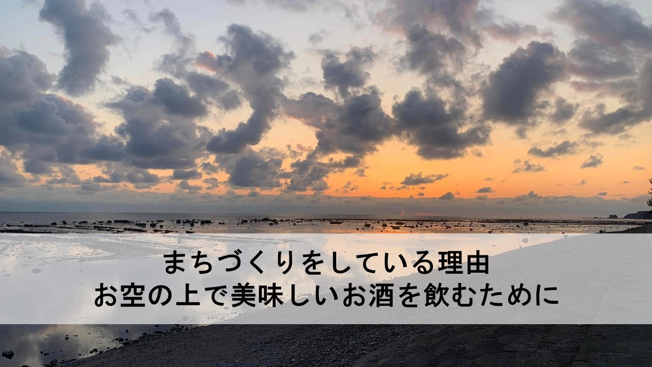 なぜ、まちづくりをしているのか聞かれますが、理由は一つで、死んだ後、お空の上で美味しいお酒を飲みたいという、ただそれだけです。