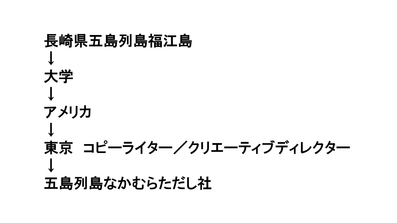 五島列島の福江島という場所で生まれ育ち、大学から(島の)外に出て、その後アメリカに行き、戻ってきて東京でコピーライター、クリエーティブディレクターになり、今は島に戻ってきて同じような仕事をしています。