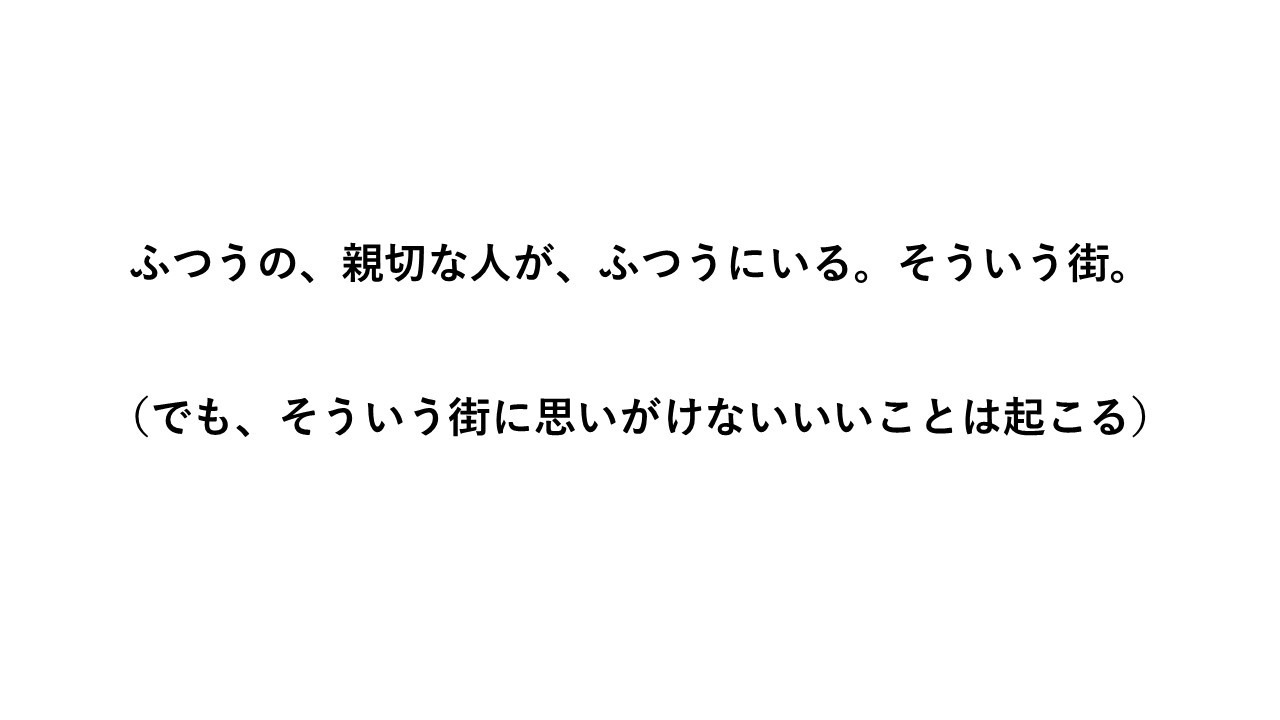 親切な人が普通にいるまち、けれども、そういうまちに思いがけない、いいことが起こるのではないかというのが、僕にとってのセンターピンではないかなと思っています。