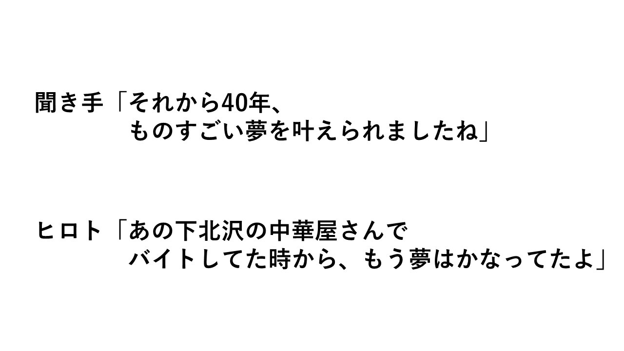 インタビュアーが当時のことを振り返って、甲本 ヒロトさんに、「それから40年、2人ともものすごい夢を叶えられましたね」と言った時に、甲本 ヒロトさんが「あの下北沢の中華屋さんでバイトしてた時から、もう夢は叶ってたよ」と言ったのです。