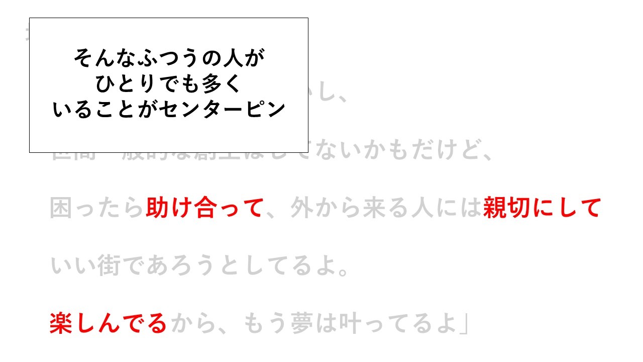 地方に住む誰か、僕の仲間の誰か、僕自身が、甲本 ヒロトさんの言葉を言い換えたとしたら、「俺の地方は有名でもないし、世間で一般的な創生とか成功はしてないかもだけど、困ったら助け合って、外から来る人には親切にして、いい町であろうとしてるよ。楽しんでるから、もう夢は叶ってるよ」という風に言ってくれたほうが、僕はいいなと思っています。