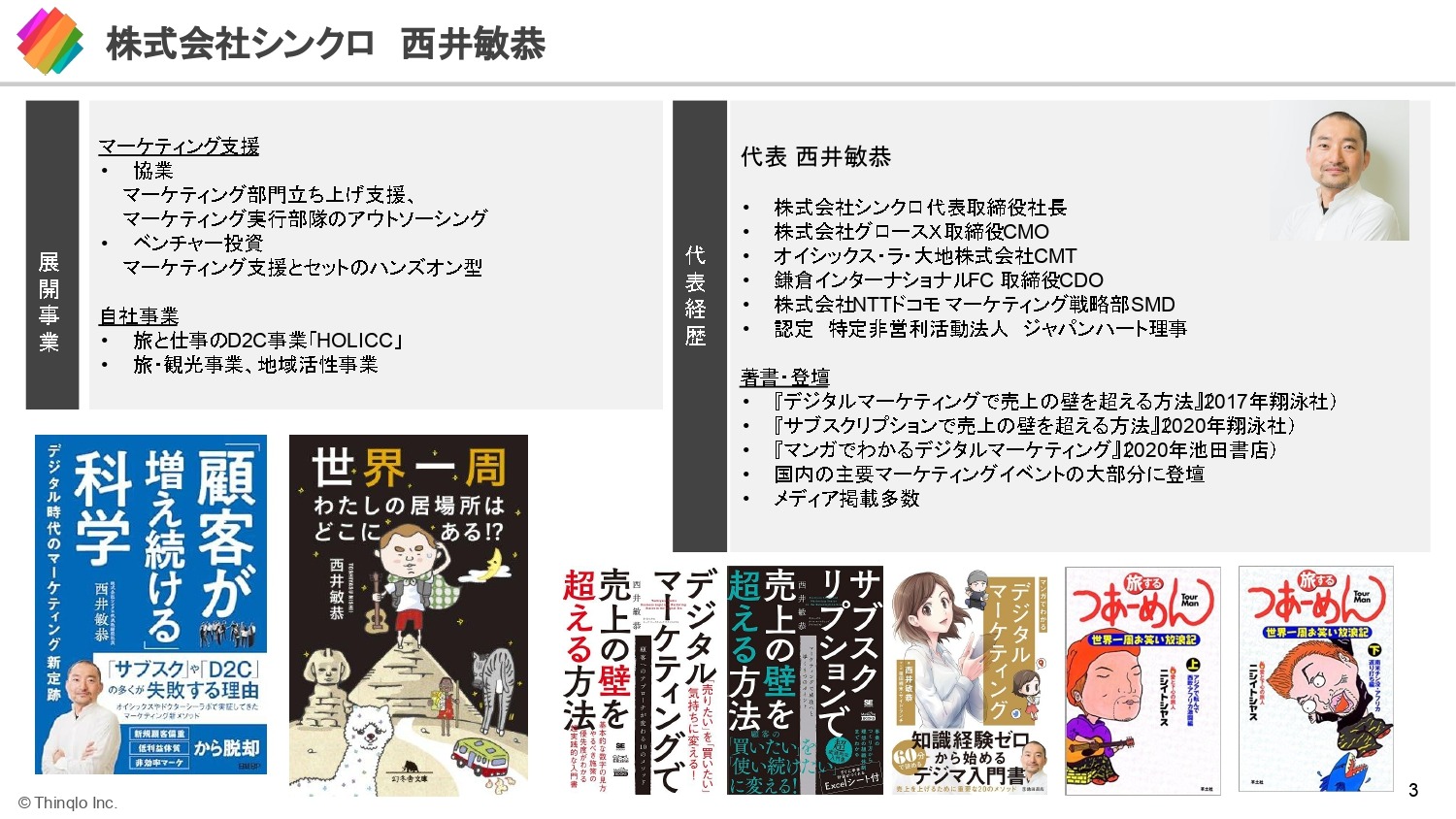 2001年から世界一周の旅に出る。帰国後、旅の本を出版し、ECの世界へ。14年に2度目の世界一周の旅をしたのち、シンクロを設立。大手通販・スタートアップなど多くの企業のマーケティング支援やデジタル事業の協業・推進を行うほか、複数企業の取締役を兼任 著書:『デジタルマーケティングで売上の壁を超える方法』(翔泳社)、『サブスクリプションで売上の壁を超える方法』(翔泳社)、『マンガでわかるデジタルマーケティング』(池田書店)