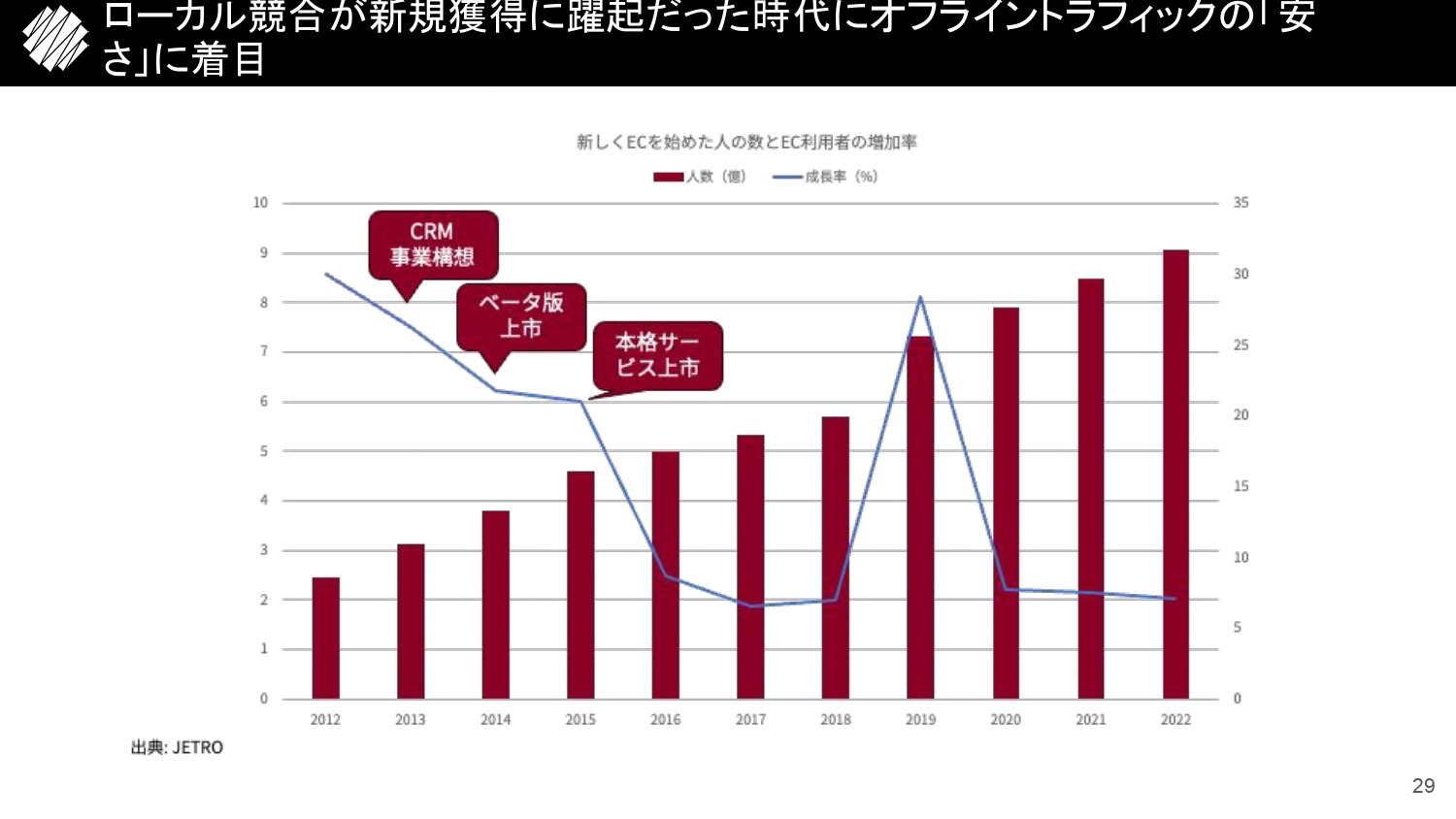 スライドの折れ線グラフが中国のECを始めた人の数、棒グラフが利用者数です。