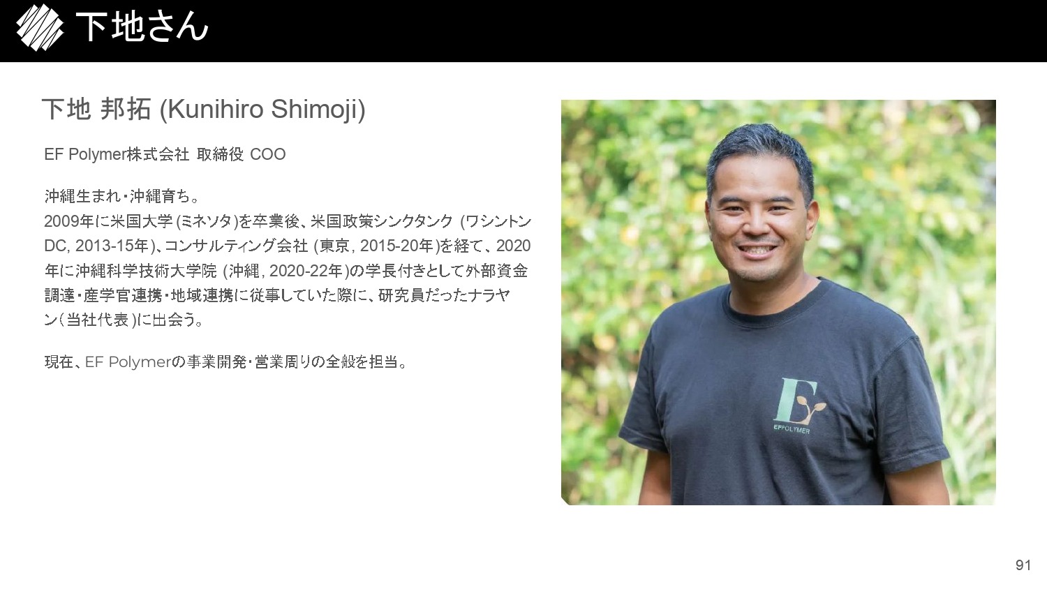 米大(国際関係論)卒業後、米国シンクタンク(ワシントンDC)、外資系コンサルティング会社(東京)を経て、2020年に出身の沖縄に戻り、沖縄科学技術大学院大学(OIST)の職員として外部資金調達、産学官連携・地域連携に従事。 2022年8月にEFポリマーに参画し、現在はCOOとしてグローバルの事業開発・セールスを統括。
