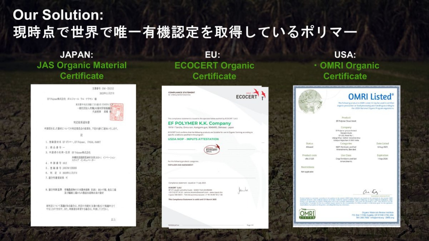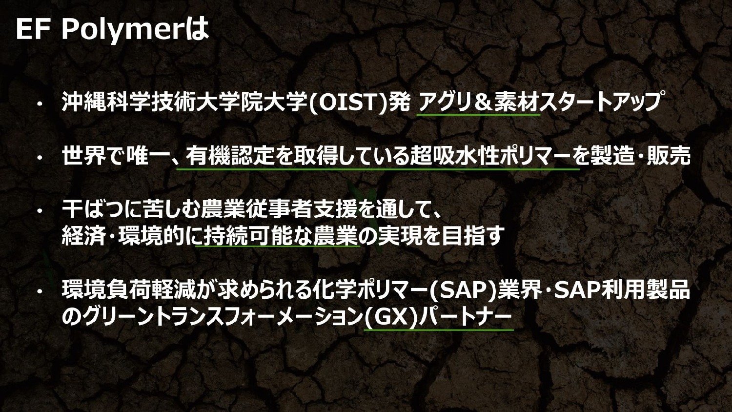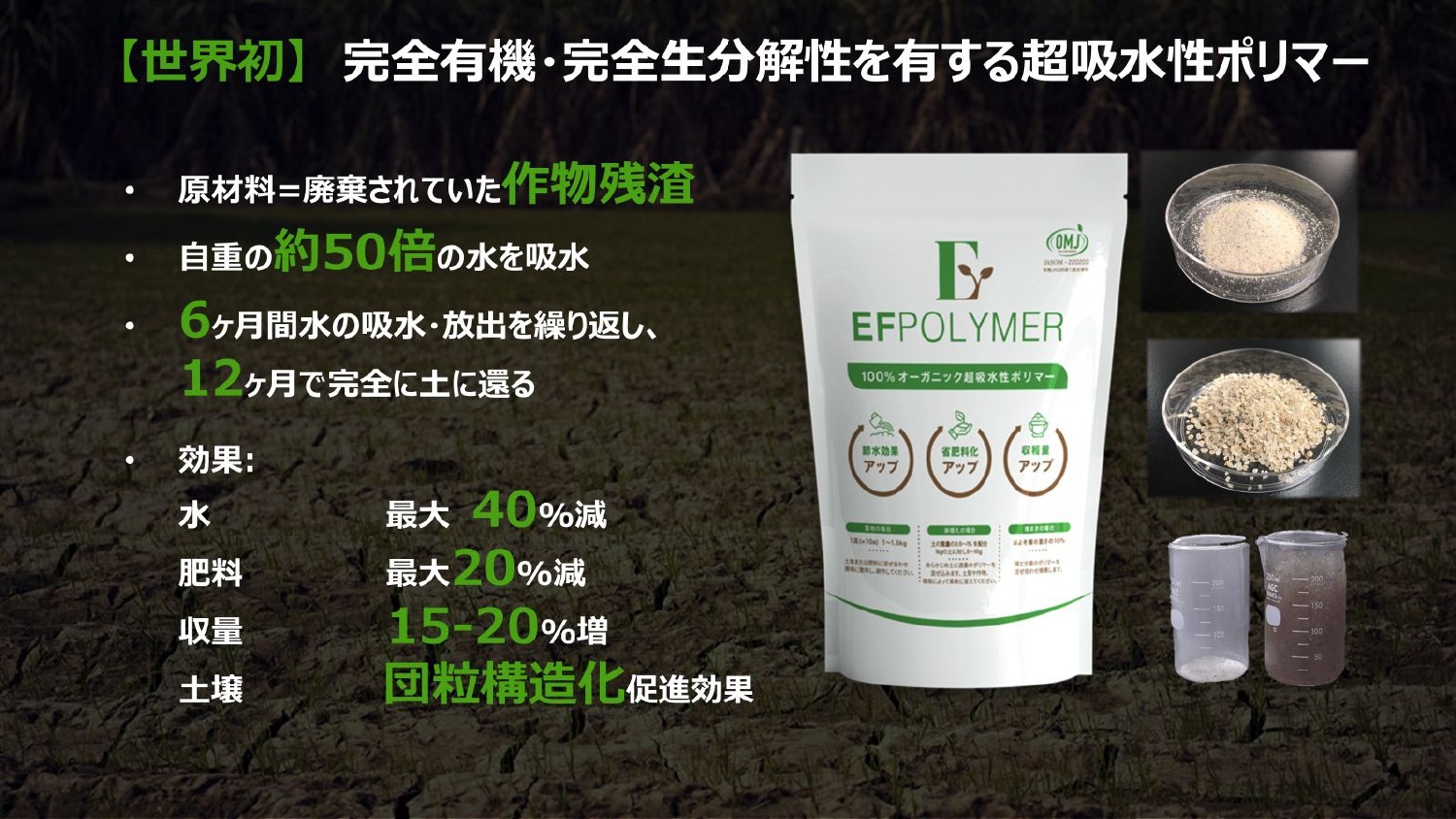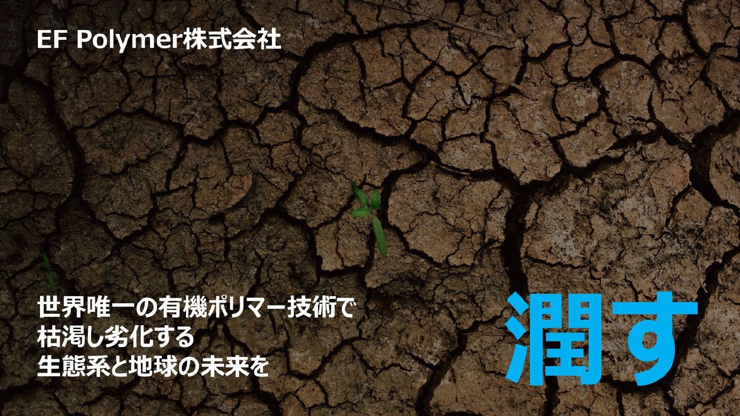 EF Polymerは、「世界唯一の有機ポリマー技術で枯渇し劣化する生態系と地球の未来を潤す」と謳っています。