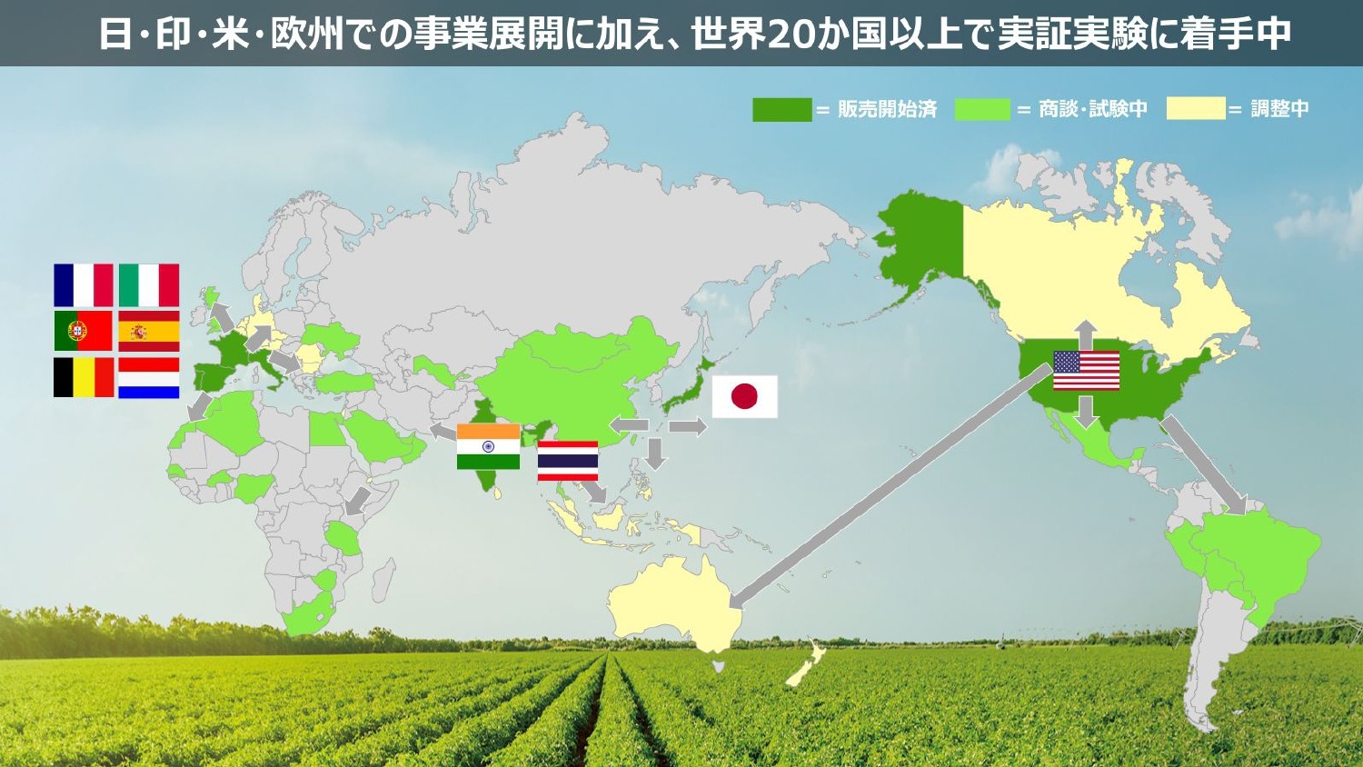 アメリカには進出しましたが、農業の資材を売るにあたって、アメリカは1州ごとに販売承認を取らなければいけないのと、土壌テストも結構大変です。