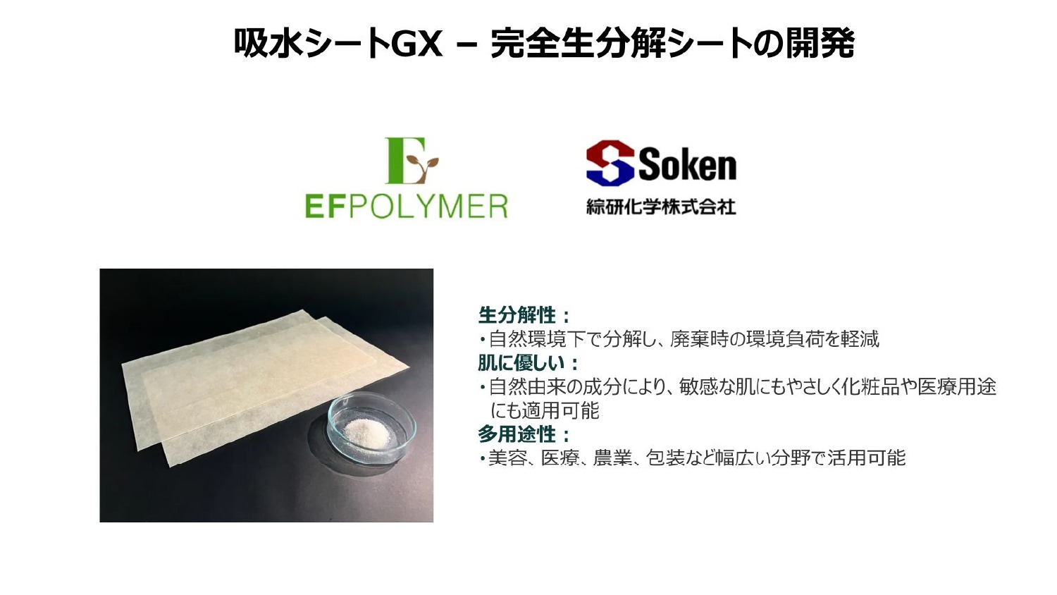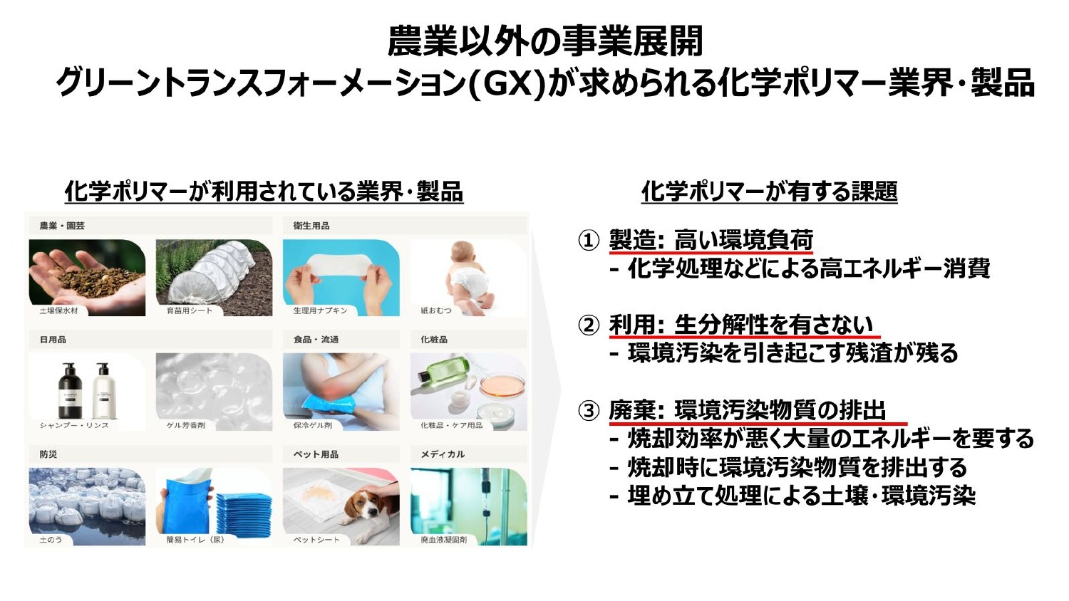 農業以外の可能性としては、さまざまな業界で使われている化学ポリマーですが、製造、利用、廃棄の観点で環境負荷が高いと言われているので、それをどう解決していくかが課題です。