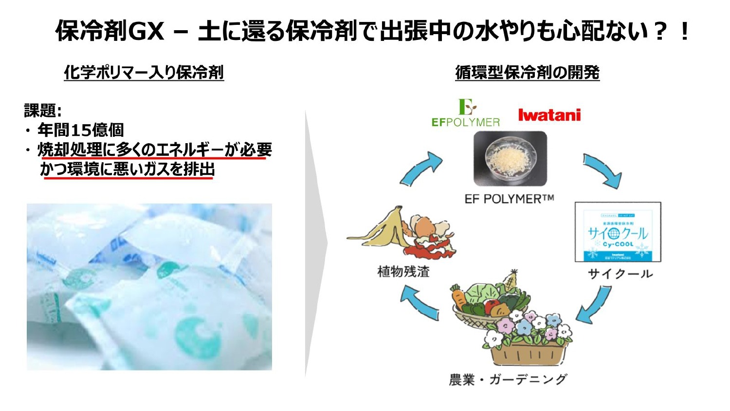 これまでの保冷剤は、クリスマスなどにケーキを買って、冷凍庫の隅に置いておいて、年末に捨てるみたいなサイクルで使われていたと思いますが、化学ポリマーを変えると、例えば、出張中に観葉植物の保水に使えるようになるので、行動変容が期待できます。