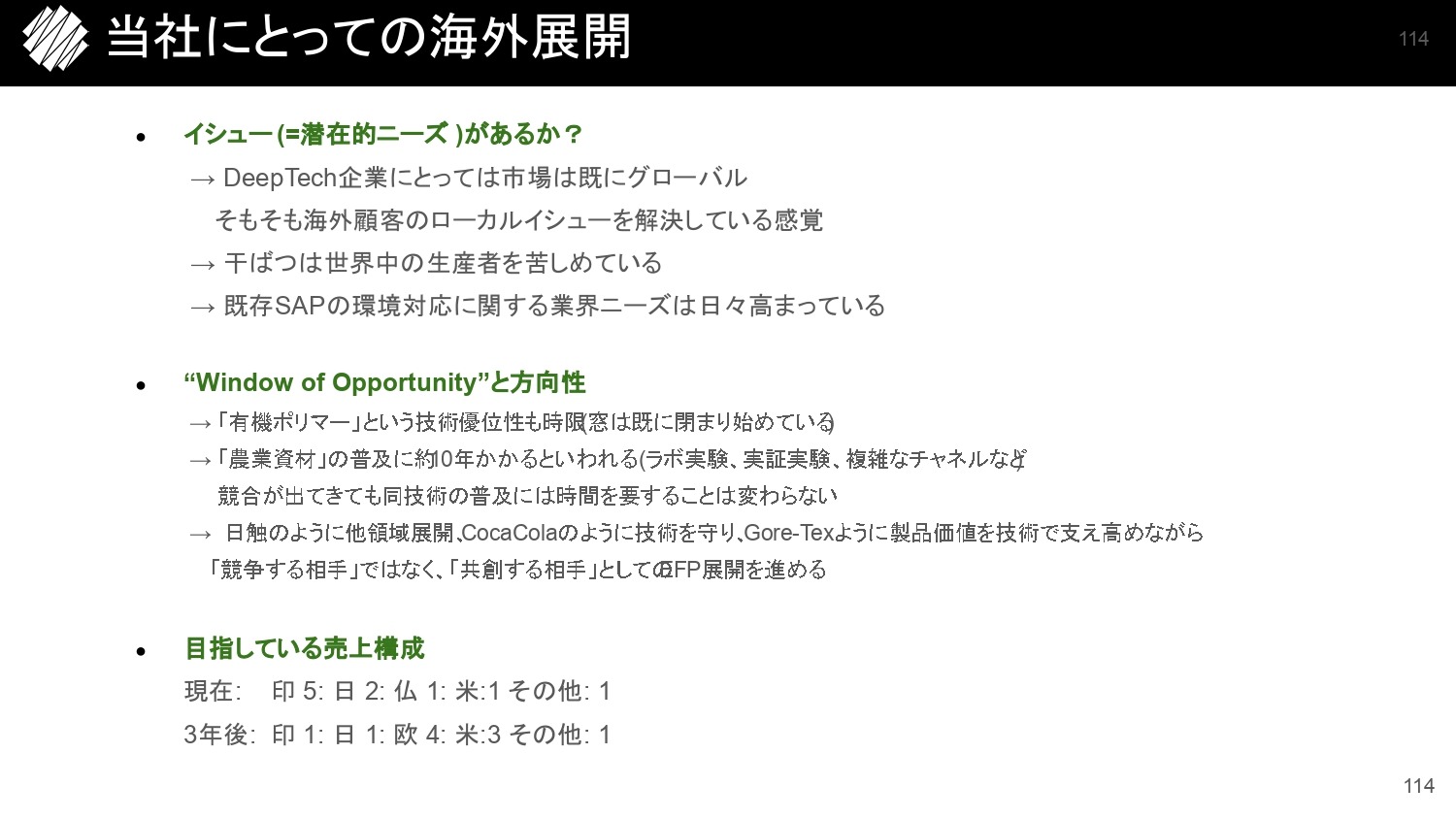 僕らの持っている方向性のイメージは、日本触媒のように他領域展開をしながら、コカコーラのように技術を守り、ゴアテックのようなブランディングをすることです。