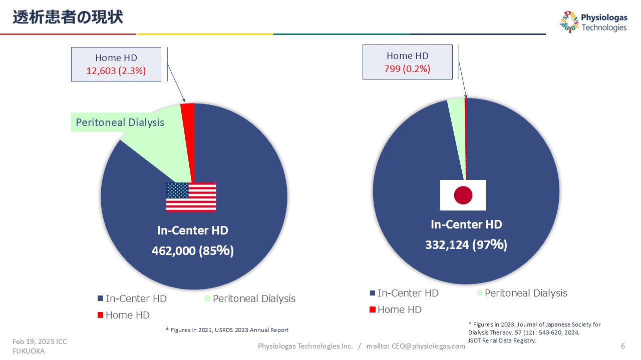 しかし、装置がない、あったとしても難しい状況なので、日本でもアメリカでも在宅で血液透析を受けている患者さんの割合はかなり少ないのが現状です。