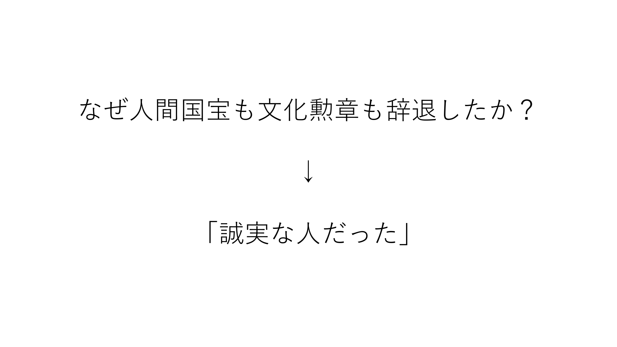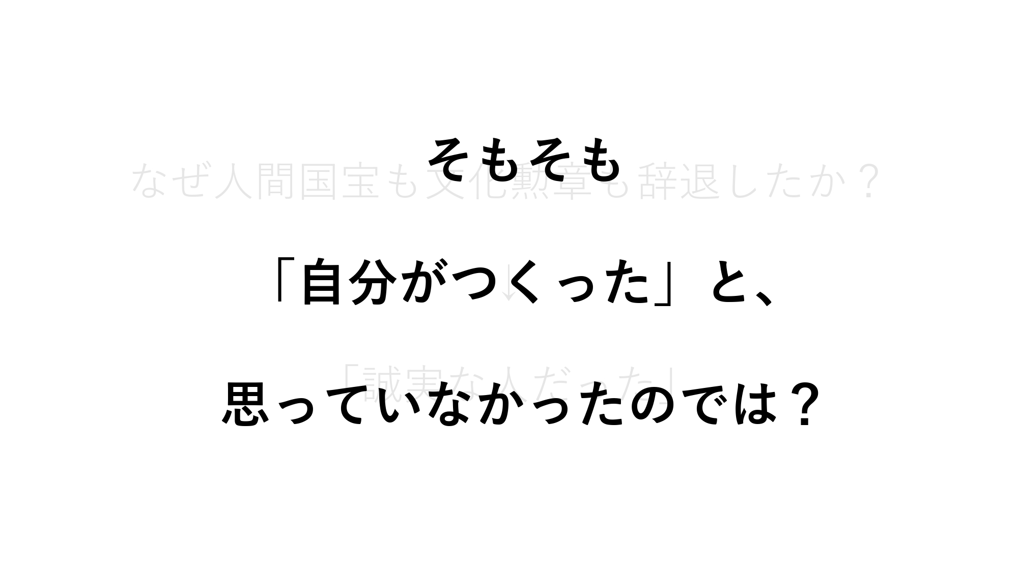 だから人間国宝も文化勲章も辞退したと言われていますが、僕は、彼はそもそも、彼の作品は自分がつくったものだと思っていなかったのではないかと思っています。