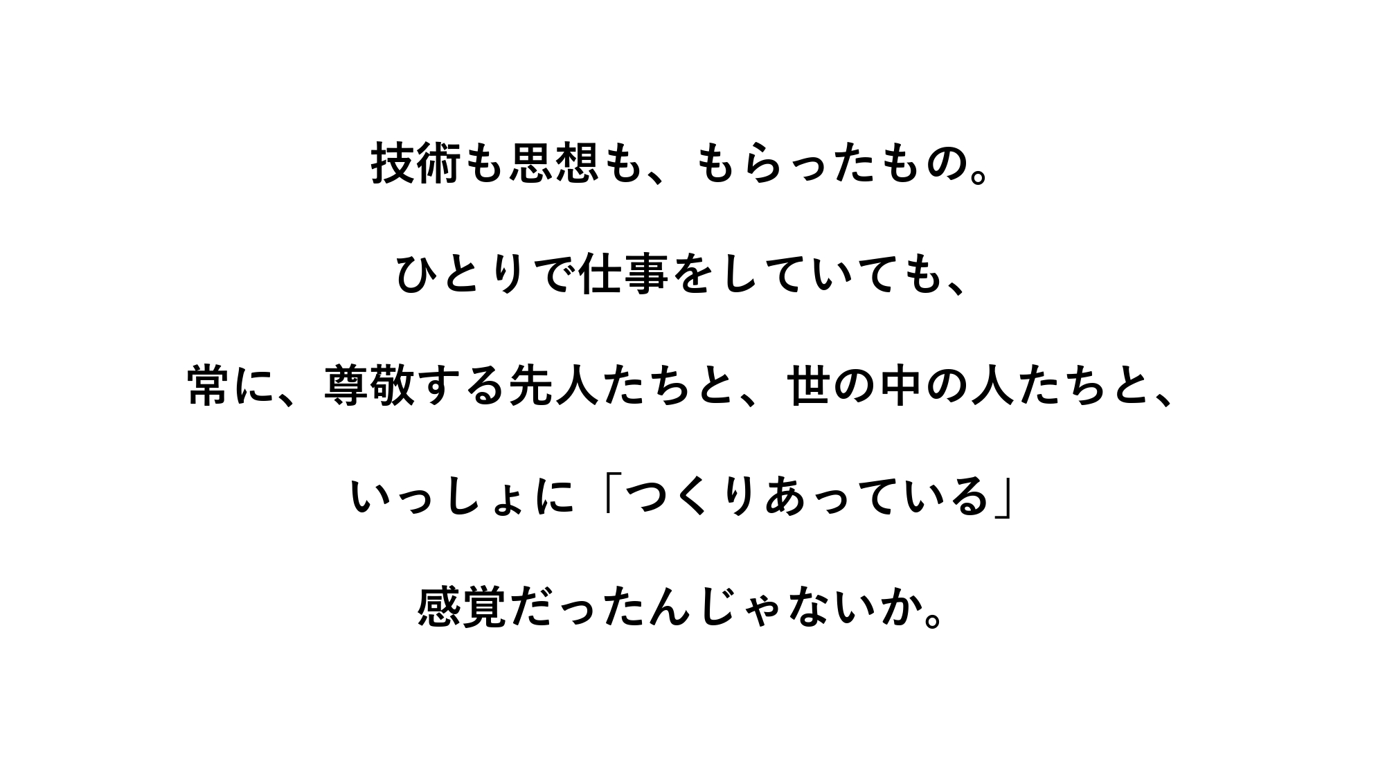 今の自分がいるのは、これまでの積み重ねがあるからこそで、自分がすごいわけではないという非常に謙虚な姿勢と、相手に敬意を払うことで、「つくる」が「つくりあう」になっていく。