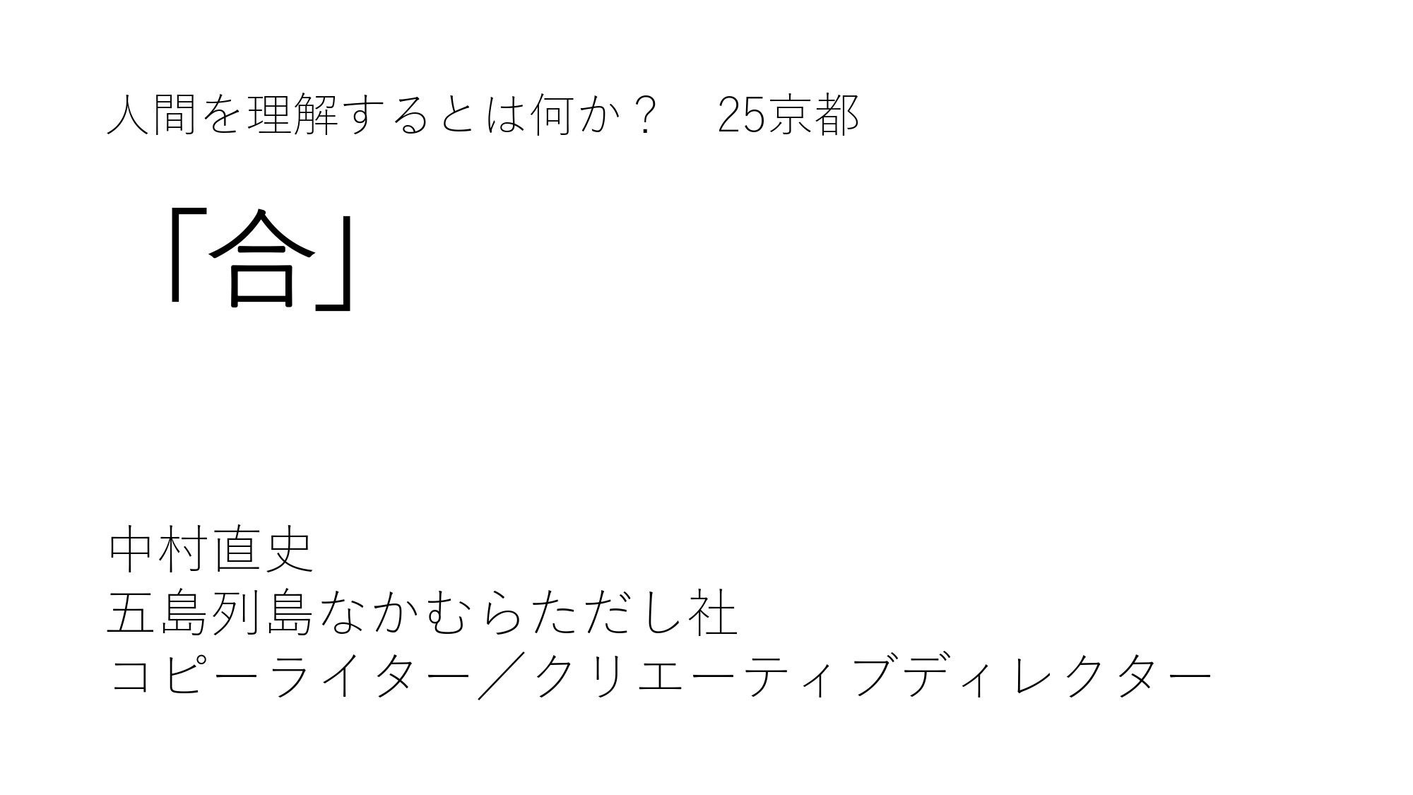 ICC KYOTO 2025のセッション「大人の教養シリーズ 人間を理解するとは何か?(シーズン14)」、全5回の最終回は、中村直史さんが登場。「合」を「つくりあう」と読み換え、力をあわせて素晴らしいもの・こと・場面が誕生する背景を考えます。スピーカーたちが「合」を考えた末にたどり着いたCo-Creationとは? 最後までぜひご覧ください!